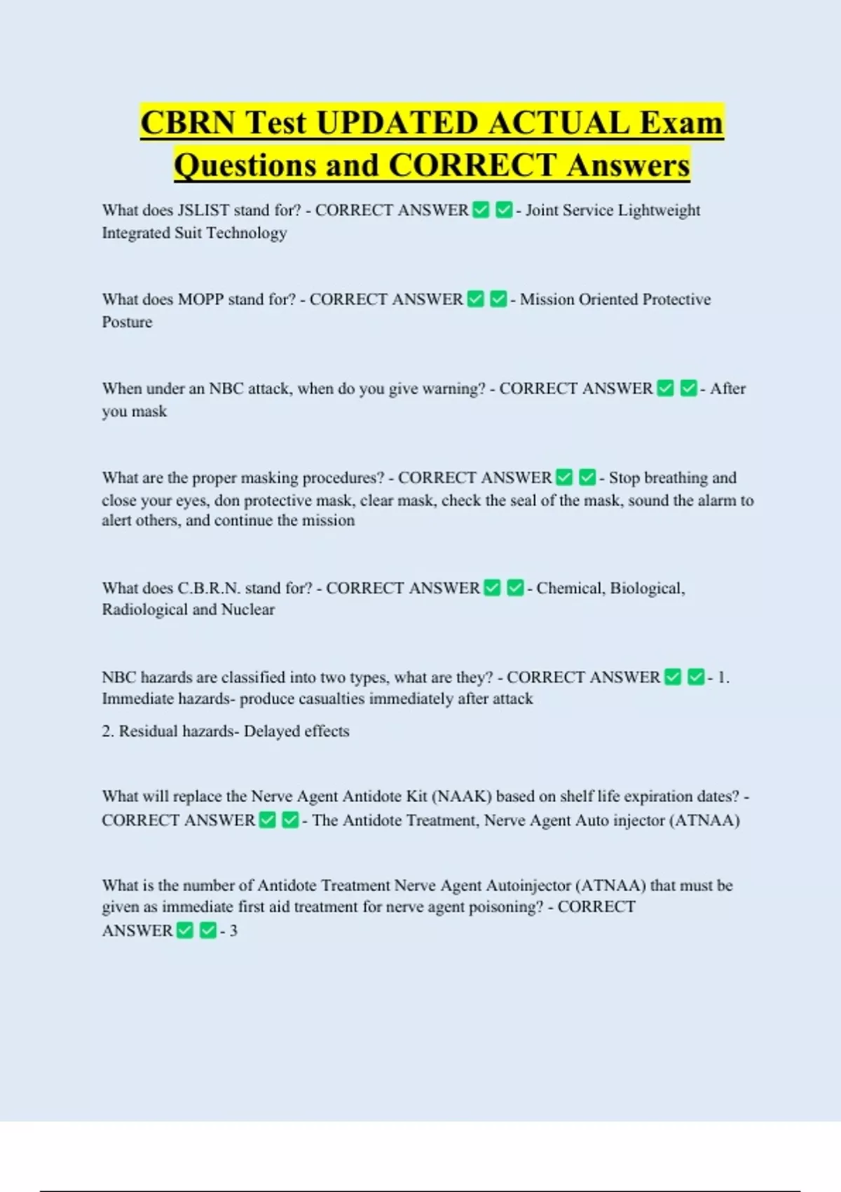 CBRN Test UPDATED ACTUAL Exam Questions and CORRECT Answers What does JSLIST stand for? - CORRECT ANSWER Integrated Suit Technology What does MOPP stand for? - CORRECT ANSWER Posture - Joint Service Lightweight - Mission Oriented Protective When under an NBC attack, when do you give warning? - CORRECT ANSWER you mask What are the proper masking procedures? - CORRECT ANSWER - After - Stop breathing and close your eyes, don protective mask, clear mask, check the seal of the mask, sound the alarm to alert others, and continue the missio