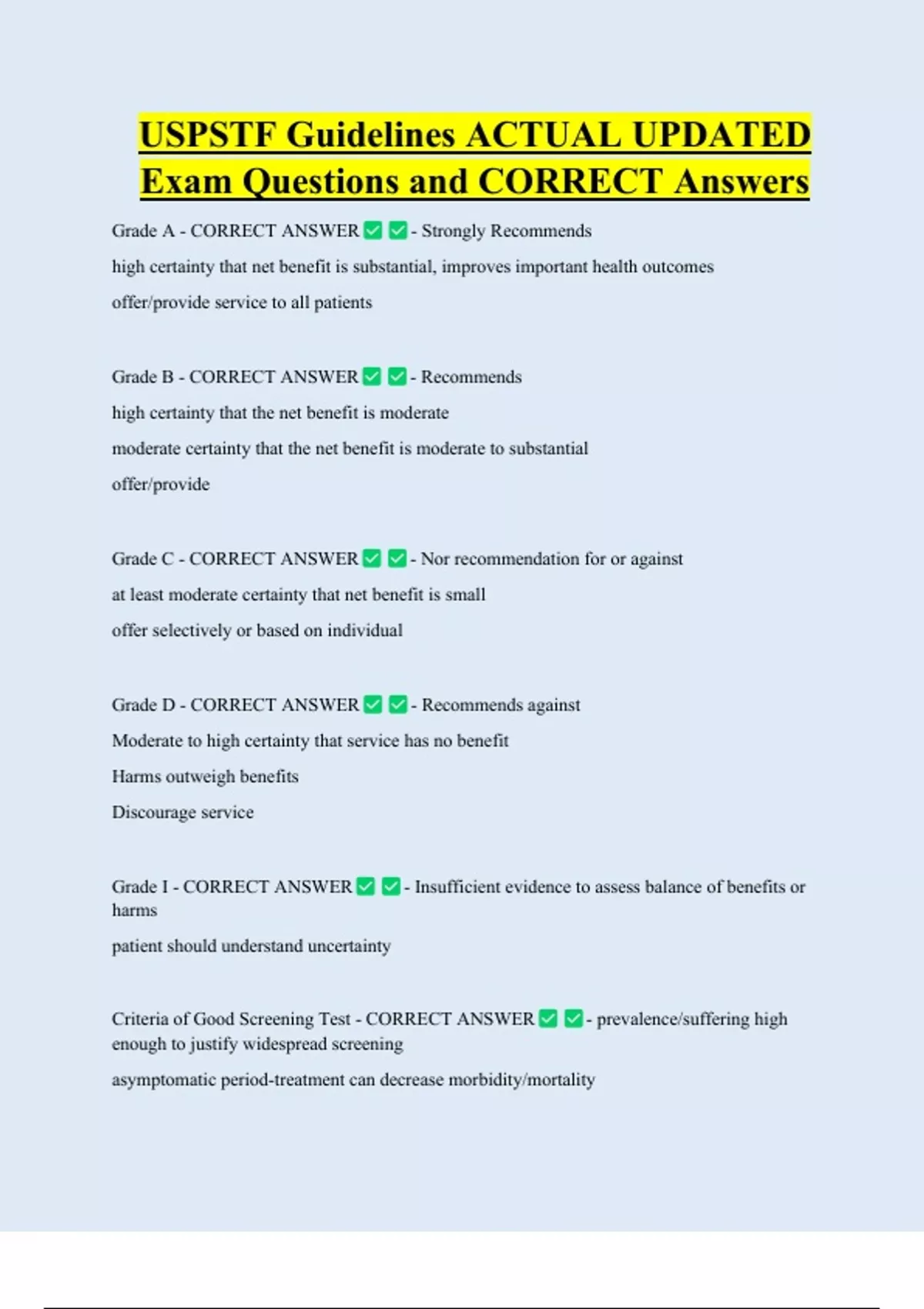 USPSTF Guidelines ACTUAL UPDATED Exam Questions and CORRECT Answers Grade A - CORRECT ANSWER - Strongly Recommends high certainty that net benefit is substantial, improves important health outcomes offer/provide service to all patients Grade B - CORRECT ANSWER - Recommends high certainty that the net benefit is moderate moderate certainty that the net benefit is moderate to substantial