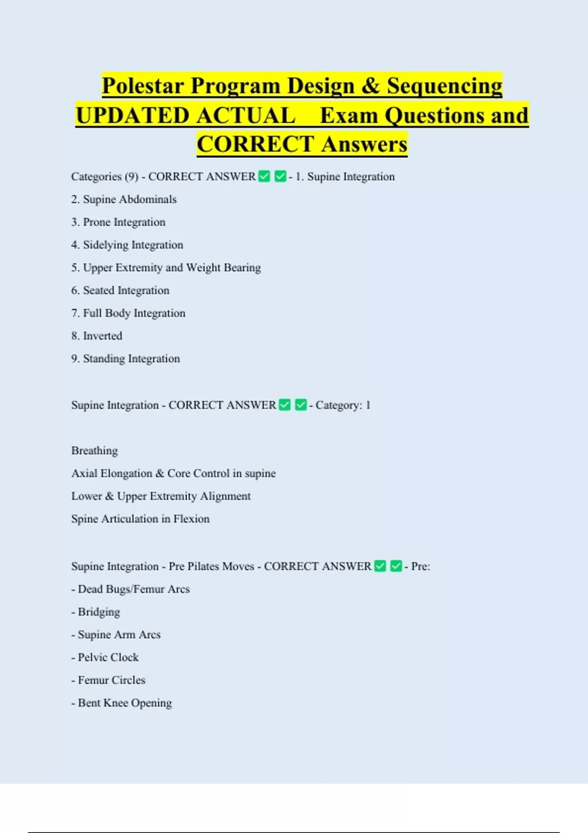 Polestar Program Design & Sequencing UPDATED ACTUAL Exam Questions and CORRECT Answers Categories (9) - CORRECT ANSWER 2. Supine Abdominals 3. Prone Integration 4. Sidelying Integration 5. Upper Extremity and Weight Bearing 6. Seated Integration 7. Full Body Integration 8. Inverted 9. Standing Integration Supine Integration - CORRECT ANSWER Breathing Axial Elongation & Core Control in supine Lower & Upper Extremity Alignment Spine Articulation in Flexion - 1. Supine Integration