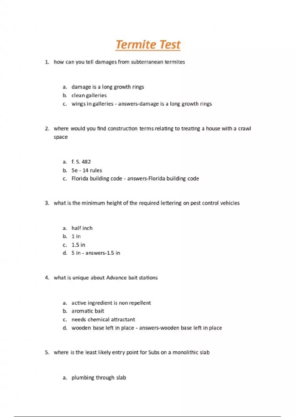 Termite Test Q&A 1. how can you tell damages from subterranean termites a. damage is a long growth rings b. clean galleries c. wings in galleries - answers-damage is a long growth rings 2. where would you find construction terms relating to treating a house with a crawl space a. f. S. 482 b. 5e - 14 rules c. Florida building code - answers-Florida building code 3. what is the minimum height of the required lettering on pest control vehicles a. half inch b. 1 in c. 1.5 in d. 5 in - answers-1.5 in 4. what is unique about Advance bait stations a. active ingredient is non repellent b. aromatic bait c. needs chemical attractant d. wooden base left in place - answers-wooden base left in place 5. where is the least likely entry point for Subs on a monolithic slab a. plumbing through slab b. slab cracks c. Hollow block d. additions - answers-Hollow block 6. if formosan termites invade another colony of Subs what would be the likely outcome a. they will become good friends Golf and drinking buddies b. they would fight c. they would replace the other Subterranean colonies - answers-they would replace the other Subterranean colonies 7. what do you have to do in case of an accidental poisoning a. notify dacs within 48 hours b. notify dacs within 24 hours c. only have to notify if death occurs - answers-notify dacs within 24 hours 8. which one of these termite nests is made up primarily of carton material a. Eastern sub b. Western sub c. formosan d. dampwood - answers-formosan 9. if you perform termite spot treatments where should you put the details a. contract b. letterhead c. wdo inspection form - answers-contract 10. how do termiticides bind with the soil a. adsorption b. absorption c. persistence - answers-adsorption...