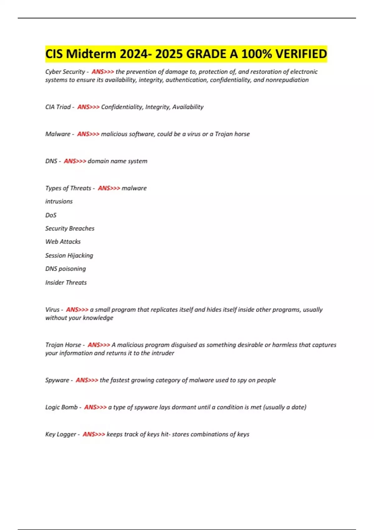 Ace your CIS Midterm 2024 with this comprehensive study guide! Covers CIA Triad, malware types (virus, Trojan, spyware), DNS poisoning, Cyber Kill Chain, encryption methods (symmetric/asymmetric), and more. Perfect for last-minute review—100% verified answers**."