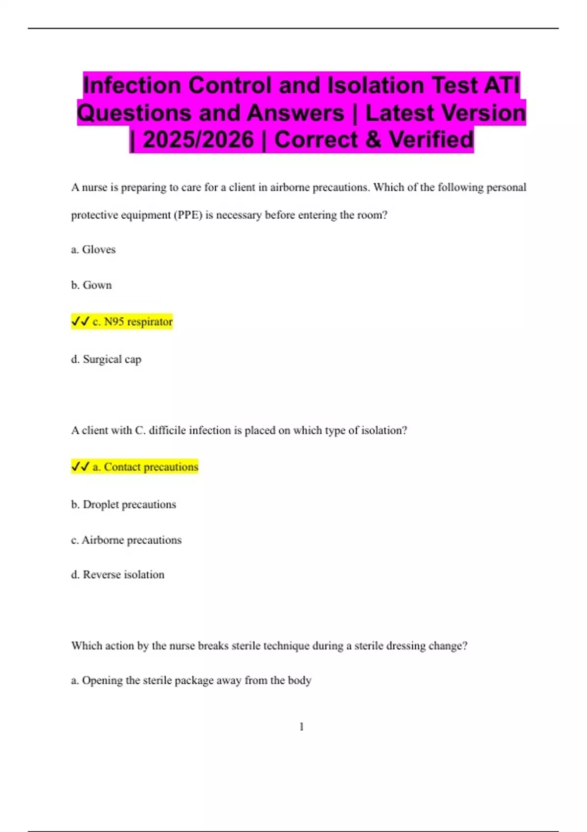 Infection Control and Isolation Test ATI Questions and Answers | Latest Version | 2025/2026 | Correct & Verified A nurse is preparing to care for a client in airborne precautions. Which of the following personal protective equipment (PPE) is necessary before entering the room? a. Gloves b. Gown c. N95 respirator d. Surgical cap A client with C. difficile infection is placed on which type of isolation? a. Contact precautions b. Droplet precautions c. Airborne precautions d. Reverse isolation Which action by the nurse breaks sterile technique during a sterile dressing change? a. Opening the sterile package away from the body 2 b. Touching sterile gauze with sterile-gloved hands c. Turning back to the sterile field d. Holding items above waist level Which of the following is an example of a portal of exit in the chain of infection? a. Sneezing b. Handshake c. Mosquito bite d. Touching a wound dressing A client has a methicillin-resistant Staphylococcus aureus (MRSA) wound infection. The nurse should: a. Place the client in a negative pressure room b. Wear gloves and gown when entering the room c. Use a HEPA filter mask d. Place the client on droplet precautions When should a nurse perform hand hygiene during client care? 3 a. After removing gloves b. Before touching a clean dressing c. After touching bodily fluids d. All of the above Which of the following statements about hand hygiene is correct? a. Only alcohol-based rub is needed after toileting b. Hand hygiene is not necessary if gloves are worn c. Use soap and water when hands are visibly soiled d. Gloves replace the need for hand washing Which PPE should be removed last after leaving an isolation room? a. Gloves b. Respirator c. Gown d. Face shield A nurse enters the room of a client on droplet precautions. What PPE is required? 4 a. Surgical mask b. N95 respirator c. Face shield only d. Gown and gloves only Which action indicates proper sterile technique? a. Holding a sterile object below the waist b. Opening a sterile package using the outermost flap first c. Reaching across the sterile field d. Turning away from the sterile field while talking Which client condition requires airborne precautions? a. MRSA b. Tuberculosis c. Norovirus d. Pneumonia To reduce the risk of catheter-associated urinary tract infection (CAUTI), the nurse should: 5 a. Use a Foley catheter for all incontinent clients b. Clean the perineal area daily c. Keep the drainage bag above the bladder d. Disconnect the catheter to collect urine How long should a nurse rub hands together with alcohol-based sanitizer? a. 20–30 seconds b. 5–10 seconds c. 1 minute d. Until hands feel dry, regardless of time A nurse is assisting in setting up a sterile field.