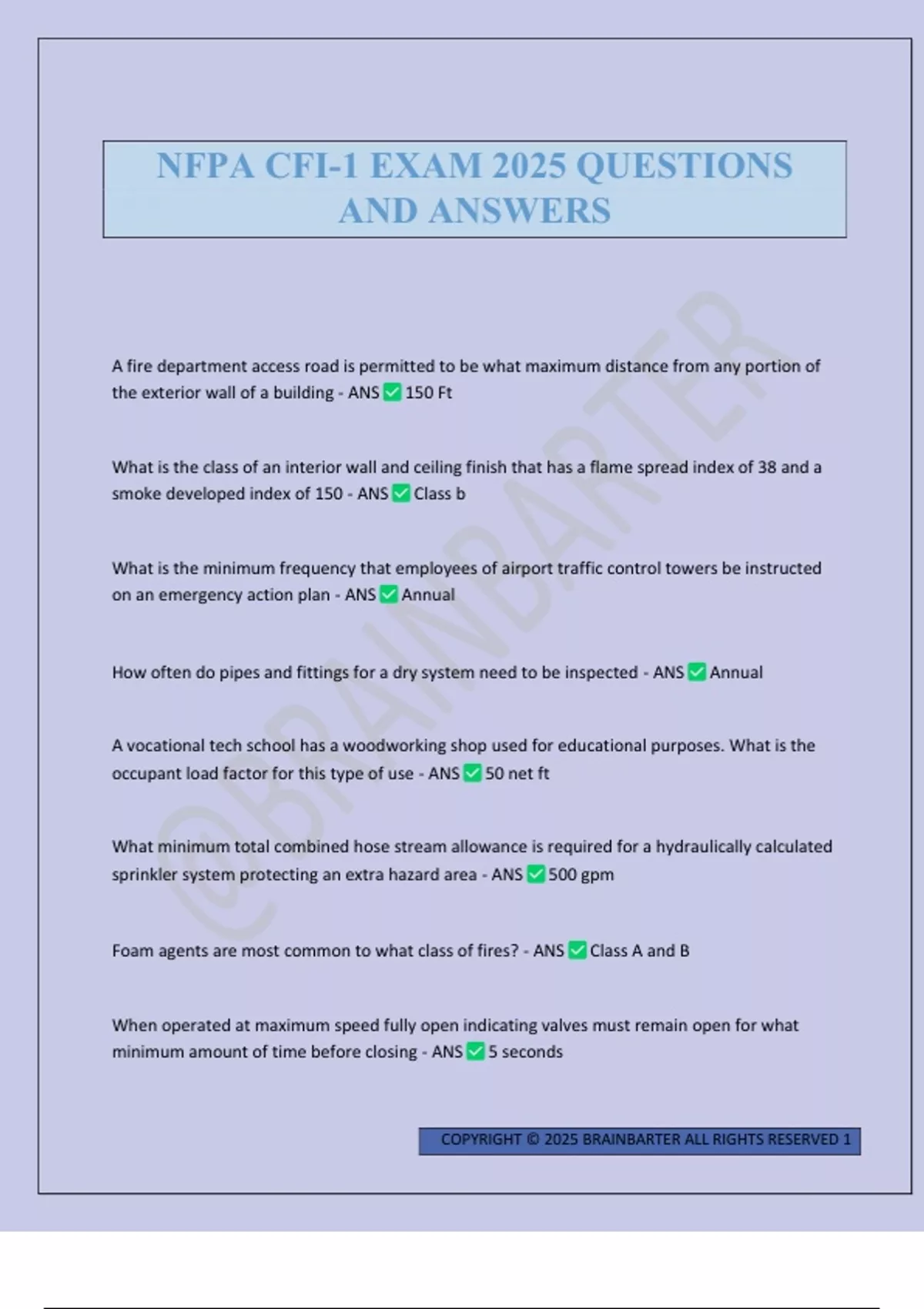 A fire department access road is permitted to be what maximum distance from any portion of the exterior wall of a building - ANS 150 Ft What is the class of an interior wall and ceiling finish that has a flame spread index of 38 and a smoke developed index of 150 - ANS Class b What is the minimum frequency that employees of airport traffic control towers be instructed on an emergency action plan - ANS Annual How often do pipes and fittings for a dry system need to be inspected - ANS Annual A vocational tech school has a woodworking shop used for educational purposes. What is the occupant load factor for this type of use - ANS 50 net ft What minimum total combined hose stream allowance is required for a hydraulically calculated sprinkler system protecting an extra hazard area - ANS 500 gpm Foam agents are most common to what class of fires? - ANS Class A and B When operated at maximum speed fully open indicating valves must remain open for what minimum amount of time before closing - ANS 5 seconds COPYRIGHT © 2025 BRAINBARTER ALL RIGHTS RESERVED 2 How much advance notice is required when inspector is investigating a complaint concerning serious fire and life safety violations - ANS No advance notice is required What is the maximum occupant load allowed for an existing sprinkler two story assembly occupancy of type ll [000] construction - ANS 300 When dots an inspector have the authority to order occupants to vacate a building - ANS If an immediate danger exist Which of the following is a verbal affirmation or declaration made under oath in a court of law - ANS Testimony Which stage of a fire within a compartment does the fuel source produce some heat but has not yet spread to other substances nearby - ANS Incipient An automatic sprinkler system is required in an airport terminals concourse when it exceeds what total floor area - ANS 12,000 ft Which of the following is describe as the propagation of a flame over a surface - ANS Flame spread Which flammable and combustible liquids must be stored in a closed tanks or containers when not in use and ambient or process temperatures are at or above their flash points - ANS Class II and III Manual fire alarm bo