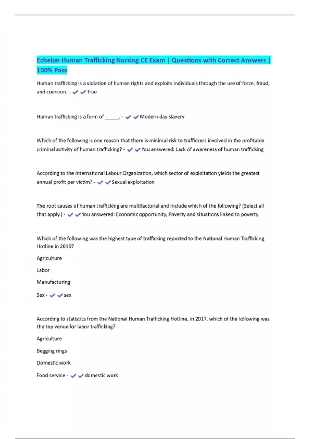 Echelon Human Trafficking Nursing CE Exam | Questions with Correct Answers | 100% Pass