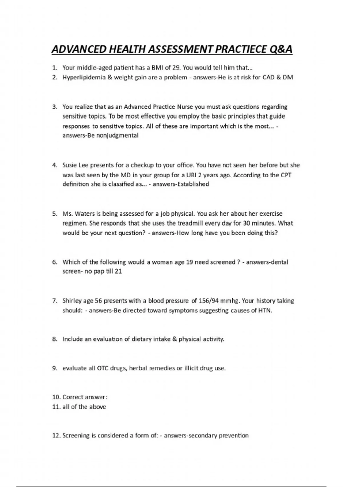 ADVANCED HEALTH ASSESSMENT PRACTIECE Q&A 1. Your middle-aged patient has a BMI of 29. You would tell him that... 2. Hyperlipidemia & weight gain are a problem - answers-He is at risk for CAD & DM 3. You realize that as an Advanced Practice Nurse you must ask questions regarding sensitive topics. To be most effective you employ the basic principles that guide responses to sensitive topics. All of these are important which is the most... - answers-Be nonjudgmental 4. Susie Lee presents for a checkup to your office. You have not seen her before but she was last seen by the MD in your group for a URI 2 years ago. According to the CPT definition she is classified as... - answers-Established 5. Ms. Waters is being assessed for a job physical. You ask her about her exercise regimen. She responds that she uses the treadmill every day for 30 minutes. What would be your next question? - answers-How long have you been doing this? 6. Which of the following would a woman age 19 need screened ? - answers-dental screen- no pap till 21 7. Shirley age 56 presents with a blood pressure of 156/94 mmhg. Your history taking should: - answers-Be directed toward symptoms suggesting causes of HTN. 8. Include an evaluation of dietary intake & physical activity. 9. evaluate all OTC drugs, herbal remedies or illicit drug use. 10. Correct answer: 11. all of the above 12. Screening is considered a form of: - answers-secondary prevention...