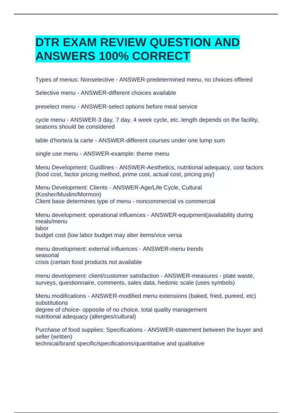 DTR EXAM REVIEW QUESTION AND ANSWERS 100% CORRECTDTR EXAM REVIEW QUESTION AND ANSWERS 100% CORRECTDTR EXAM REVIEW QUESTION AND ANSWERS 100% CORRECT Types of menus: Nonselective - ANSWER-predetermined menu, no choices offered Selective menu - ANSWER-different choices available preselect menu - ANSWER-select options before meal service cycle menu - ANSWER-3 day, 7 day, 4 week cycle, etc..length depends on the facility, seasons should be considered