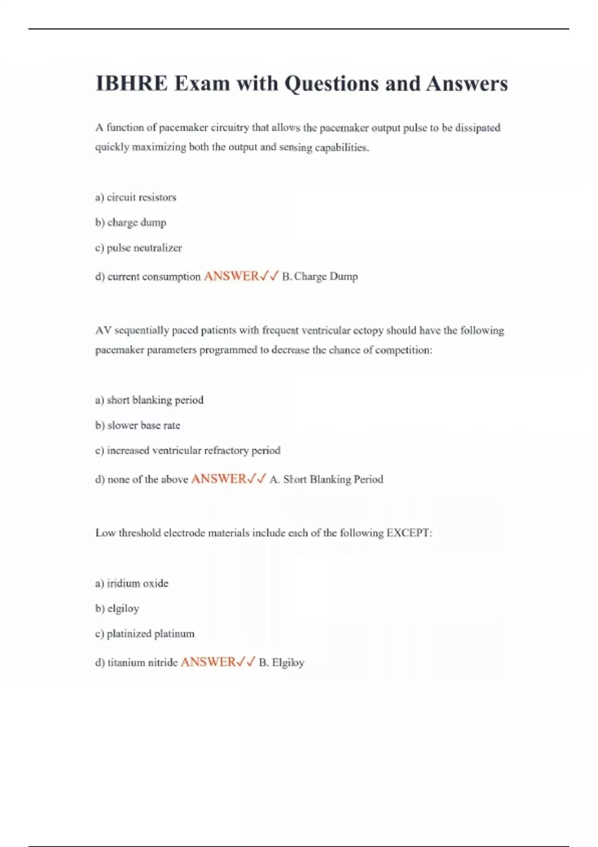 IBHRE Exam with Questions and Answers A function of pacemaker circuitry that allows the pacemaker output pulse to be dissipated quickly maximizing both the output and sensing capabilities. a) circuit resistors b) charge dump c) pulse neutralizer d) current consumption ANSWER B. Charge Dump AV sequentially paced patients with frequent ventricular ectopy should have the following pacemaker parameters programmed to decrease the chance of competition: a) short blanking period b) slower base rate c) increased ventricular refractory period d) none of the above ANSWER A. Short Blanking Period Low threshold electrode materials include each of the following EXCEPT: a) iridium oxide b) elgiloy c) platinized platinum d) titanium nitride ANSWER B. Elgiloy