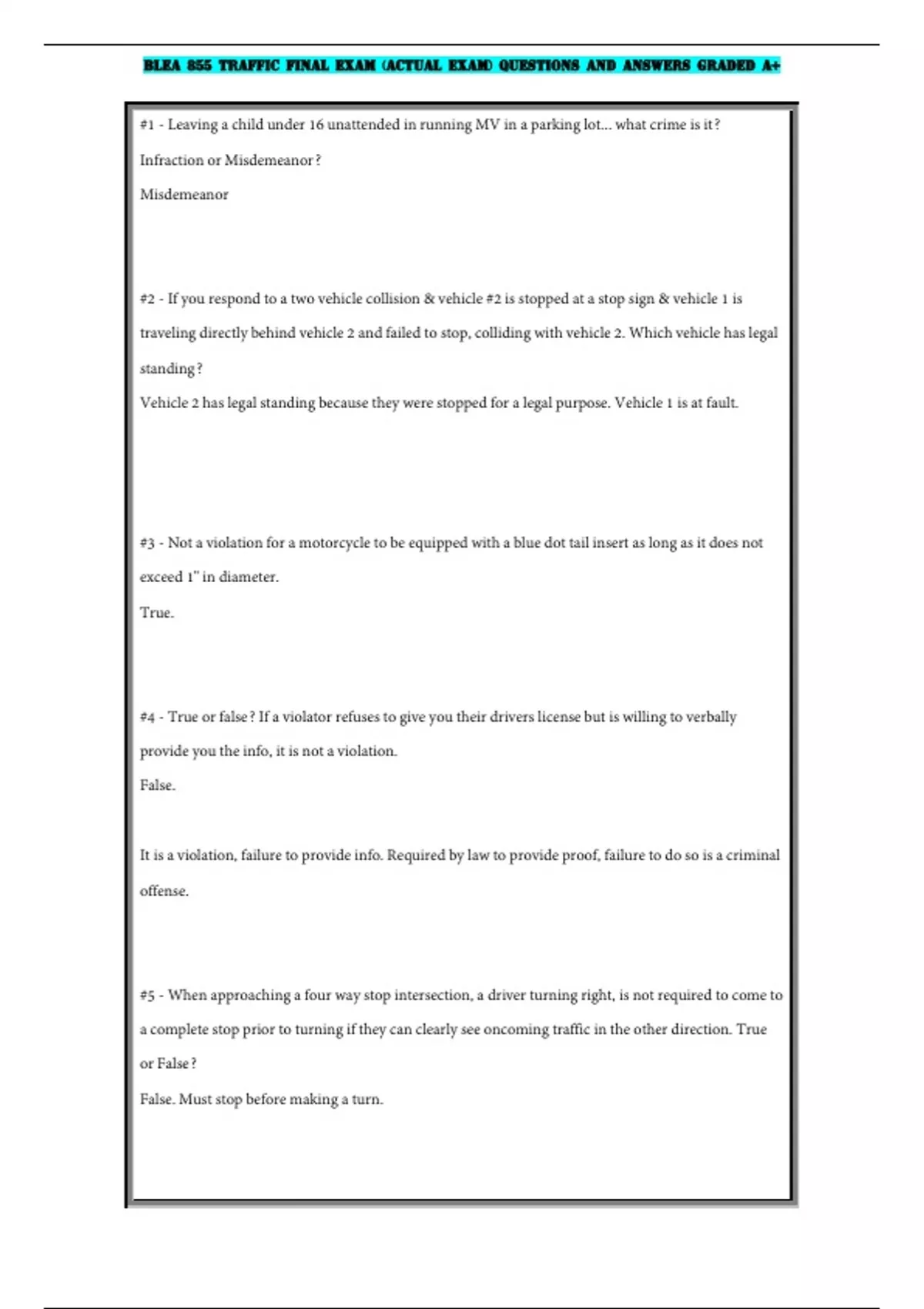 BLEA 855 Traffic Final Exam (Actual Exam) Questions and Answers Graded A+