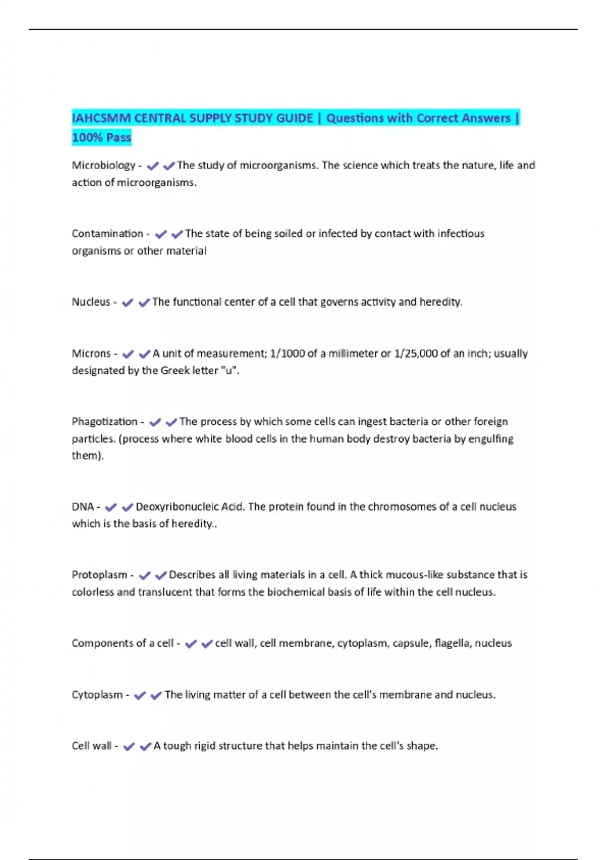 IAHCSMM CENTRAL SUPPLY STUDY GUIDE | Questions with Correct Answers | 100% Pass