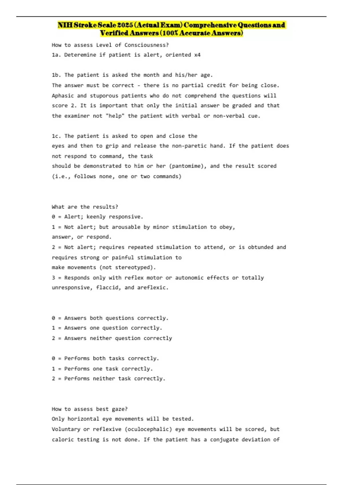 NIH Stroke Scale 2025 (Actual Exam) Comprehensive Questions and