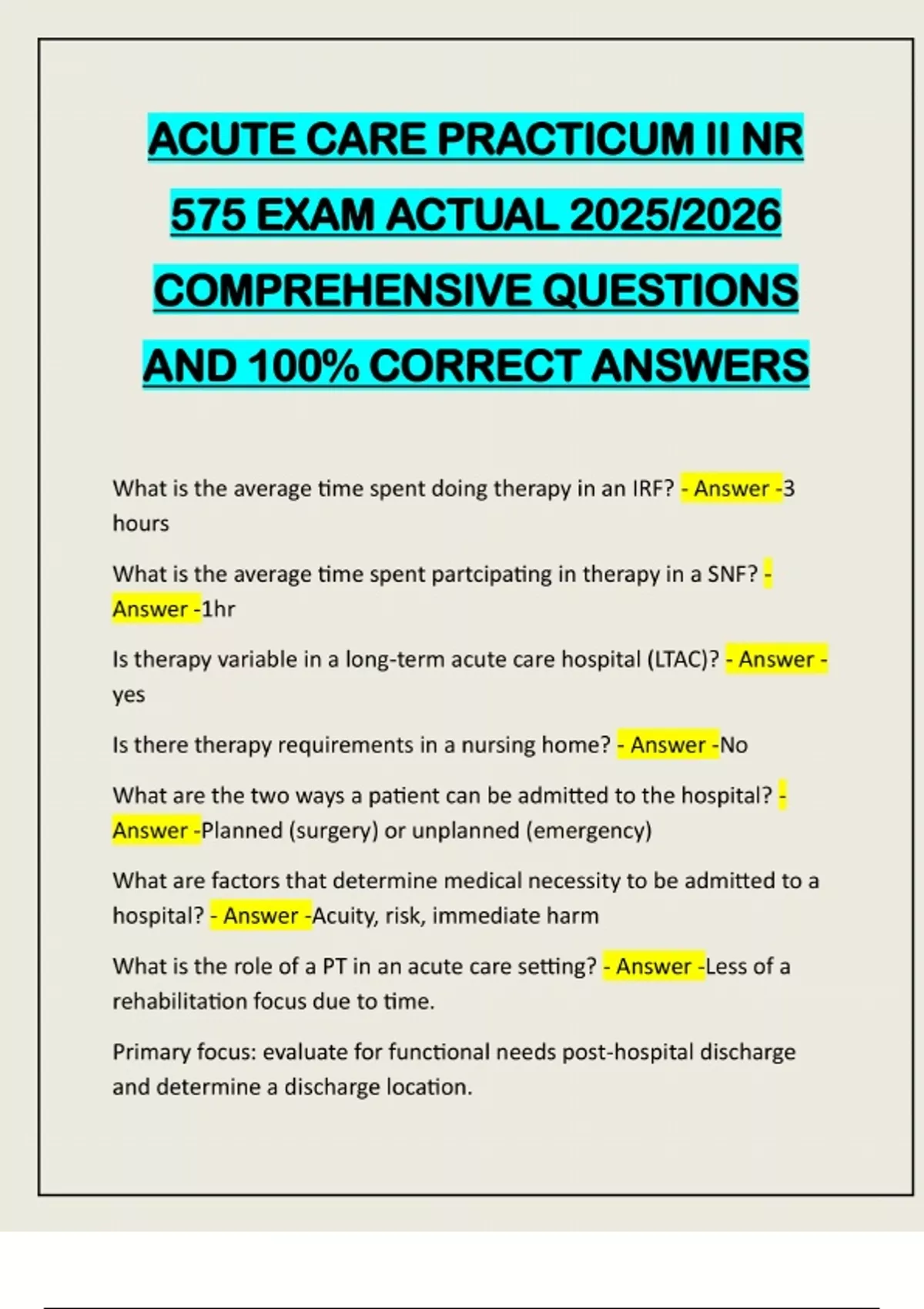 ACUTE CARE PRACTICUM II NR 575 EXAM ACTUAL 2025/2026 COMPREHENSIVE QUESTIONS AND 100% CORRECT ANSWERS What is the average time spent doing therapy in an IRF? - Answer -3 hours What is the average time spent partcipating in therapy in a SNF? - Answer -1hr Is therapy variable in a long-term acute care hospital (LTAC)? - Answer - yes Is there therapy requirements in a nursing home? - Answer -No What are the two ways a patient can be admitted to the hospital? - Answer -Planned (surgery) or unplanned (emergency) What are factors that determine medical necessity to be admitted to a hospital? - Answer -Acuity, risk, immediate harm What is the role of a PT in an acute care setting? - Answer -Less of a rehabilitation focus due to time. Primary focus: evaluate for functional needs post-hospital discharge and determine a discharge location.What are barriers to discharge? - Answer -Equipment needs social support cognition functional status What type of measures/activities are done in an acute setting to asses for function? - Answer -Rolling supine to sit sit to stand transfers ambulation w/c mobility stairs What is Max A? - Answer -Pt does 75-99% of activity What is Mod A? - Answer -Pt does 50-74% of activity What is Min A? - Answer -Pt does 24-49% of activity What is total/dependent assist? - Answer -Pt does <25% of activity What are some lines that are not high risk? - Answer -Supplementa