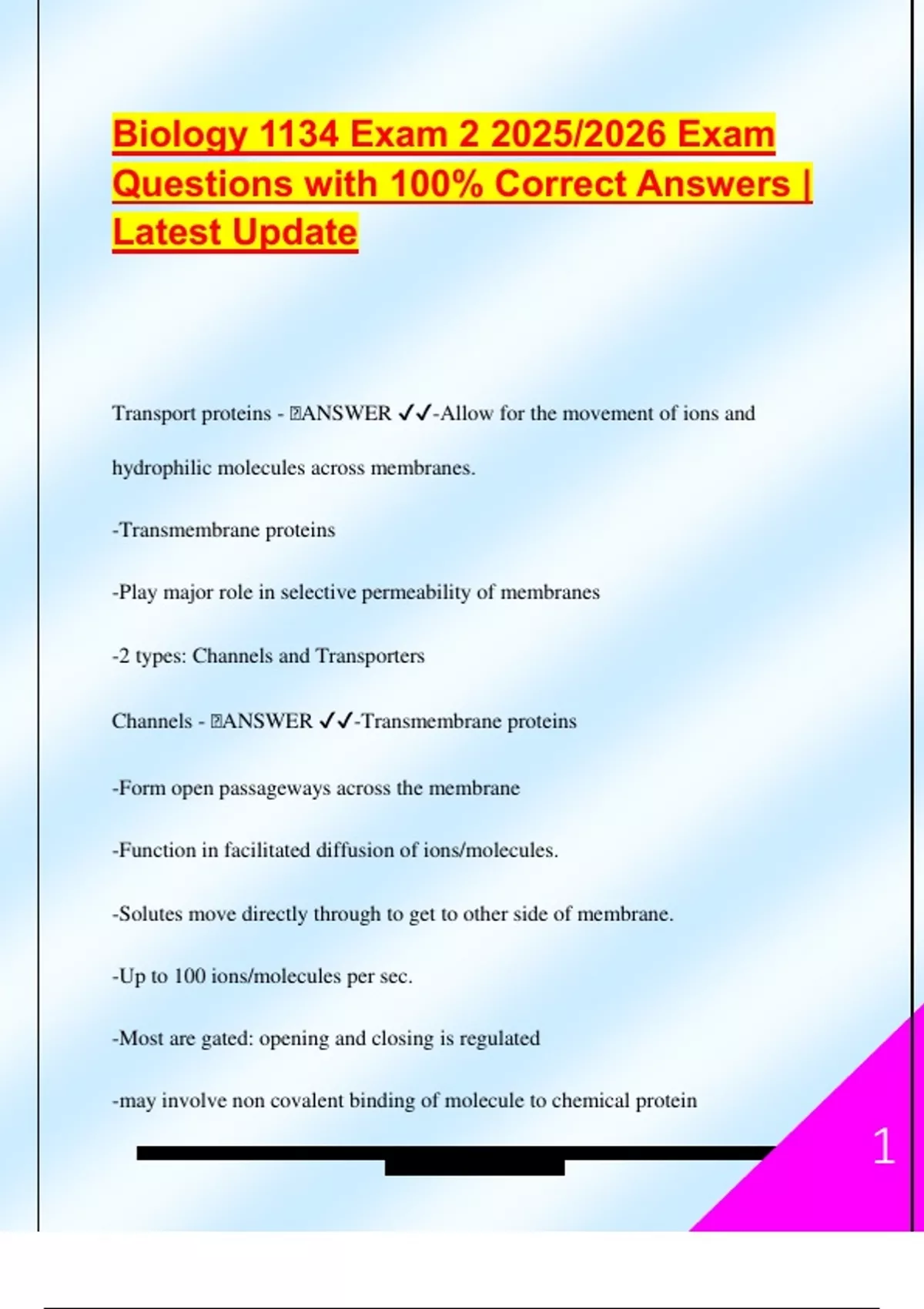Biology 1134 Exam 2 2025/2026 Exam Questions with 100% Correct Answers | Latest Update Transport proteins -