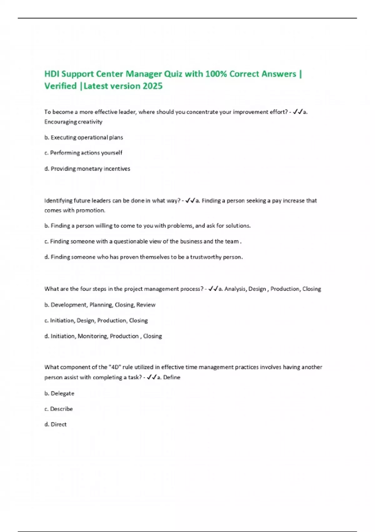 HDI Support Center Manager Quiz with 100% Correct Answers | Verified |Latest version 2025