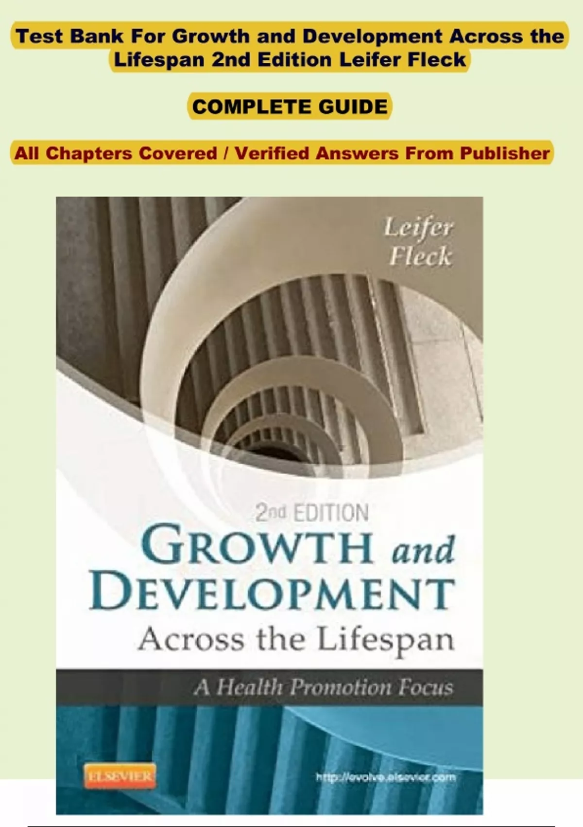 Test Bank For Growth and Development Across the Lifespan 3rd Edition By Gloria Leifer; Eve Fleck. Full Chapters Include;... 1: Healthy People 2030 2: Government Influences on Health Care 3: Cultural Considerations Across the Lifespan and in Health and Illness 4: The Influence of Family on Developing a Lifestyle 5: Theories of Development 6: Prenatal Influences on Healthy Development 7: The Infant 8: Early Childhood 9: Middle Childhood 10: Adolescence 11: Young Adulthood 12: Middle Adulthood 13: Late Adulthood 14: Advanced Old Age and Geriatrics 15: Planning for the End of Life 16: Loss, Grief, and Bereavement