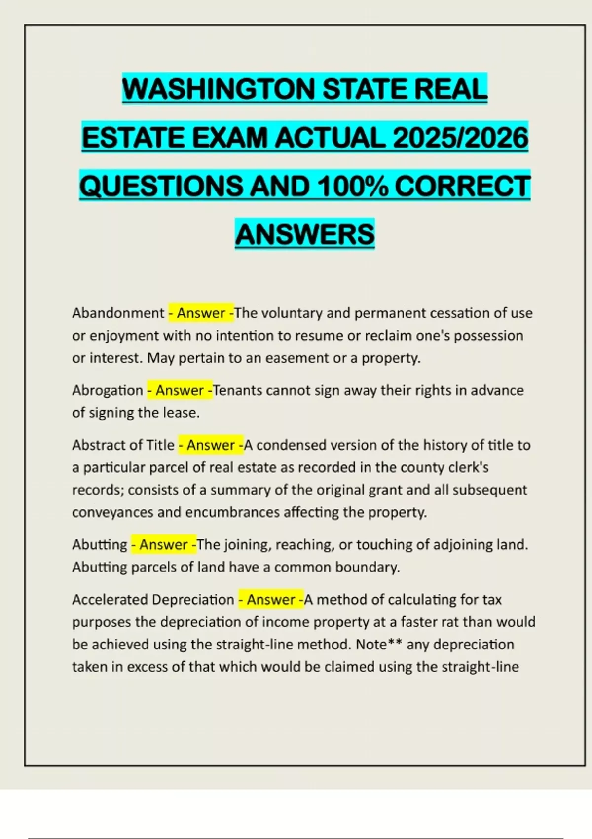 WASHINGTON STATE REAL ESTATE EXAM ACTUAL 2025/2026 QUESTIONS AND 100% CORRECT ANSWERS Abandonment - Answer -The voluntary and permanent cessation of use or enjoyment with no intention to resume or reclaim one's possession or interest. May pertain to an easement or a property. Abrogation - Answer -Tenants cannot sign away their rights in advance of signing the lease. Abstract of Title - Answer -A condensed version of the history of title to a particular parcel of real estate as recorded in the county clerk's records; consists of a summary of the original grant and all subsequent conveyances and encumbrances affecting the property. Abutting - Answer -The joining, reaching, or touching of adjoining land. Abutting parcels of land have a common boundary. Accelerated Depreciation - Answer -A method of calculating for tax purposes the depreciation of income property at a faster rat than would be achieved using the straight-line method. Note** any depreciation taken in excess of that which would be claimed using the straight-linerate is subject to recapture as ordinary income to the extent of gain resulting from the sale. Acceleration Clause - Answer -A provision in a written mortgage, note, bond, or conditional sales contract that, in the event of a default, the whole amount of principal and interest may be declared to be due an payable at once. Accretion - Answer -An increase or addition to land by the deposit of sand or soil washed up naturally from a river lake or sea. Accrued Depreciation - Answer -The actual depreciation that has occurred to a property at any given date; the difference between the cost of replacement new (as of the date of appraisal) and the present appraised value. Acknowledgment - Answer -A declaration made by a person to a notary public, or other public official authorized to take acknowledgments that an instrument was executed by that person as a free and voluntary act. Actual Eviction - Answer -The result of legal action originated by a lessor, whereby a defaulted tenant is physically ousted from the rented property pursuant to a court order. Actual Notice - Answer -Express information or fact; that which is know; actual knowledge. Adjustable-rate Mortgage - Answer -A mortgage in which the interest rate changes at predetermined intervals. The mortgage has caps, or a ceiling, that limits the amount it can change at the predetermined intervals.Administrator - Answer -The party appointed by the county court to settle the estate of a deceased person who died without leaving a will. Ad Valorem Tax - Answer -A tax levied according to value; generally used to refer to real estate tax. Also called the general tax. Adverse possession - Answer -The right of an occupant of land to acquire title against the real owner, where possession has been actual, continuous, hostile, visible, and distinct for the statutory period. Affidavit - Answer -A written stateme