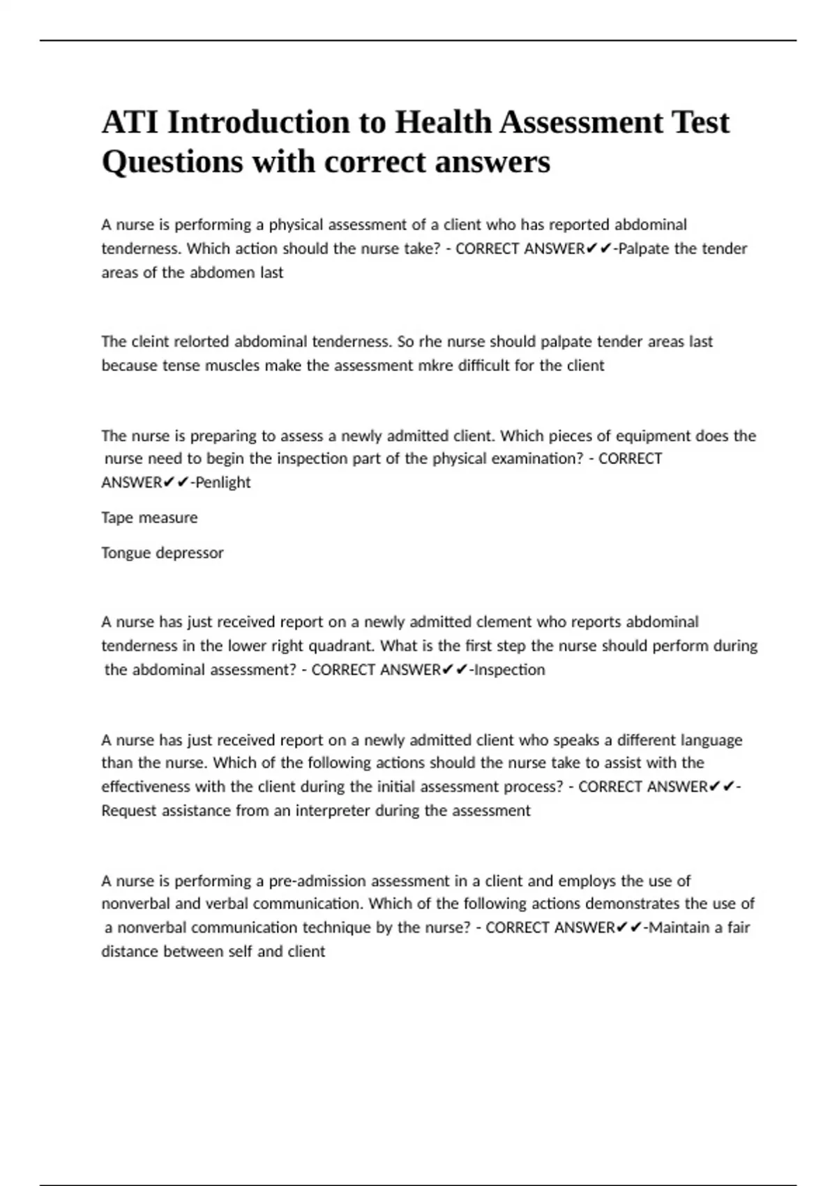 ATI Introduction to Health Assessment Test Questions with correct answers.
