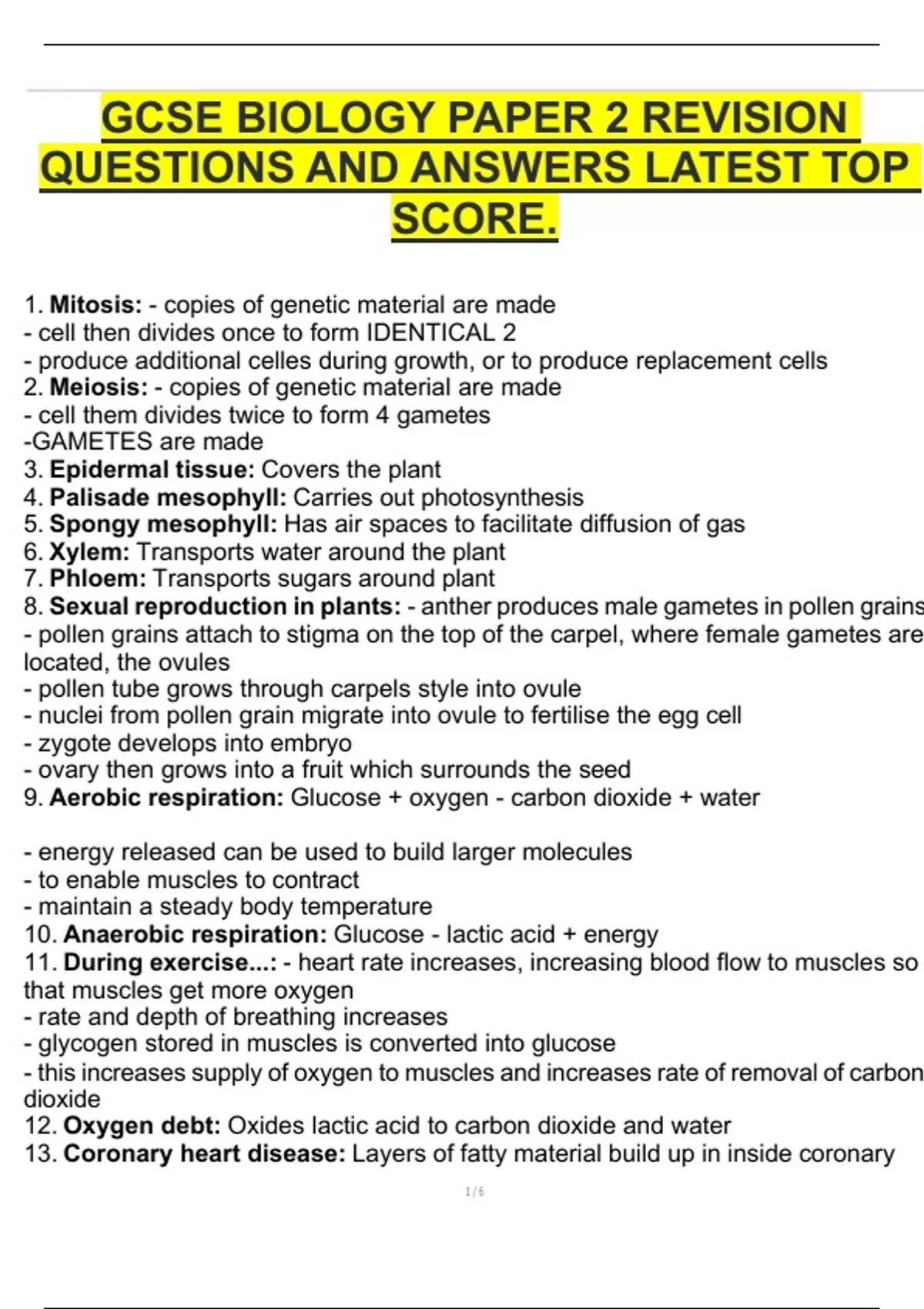 GCSE BIOLOGY PAPER 2 REVISION QUESTIONS AND ANSWERS LATEST TOP SCORE.