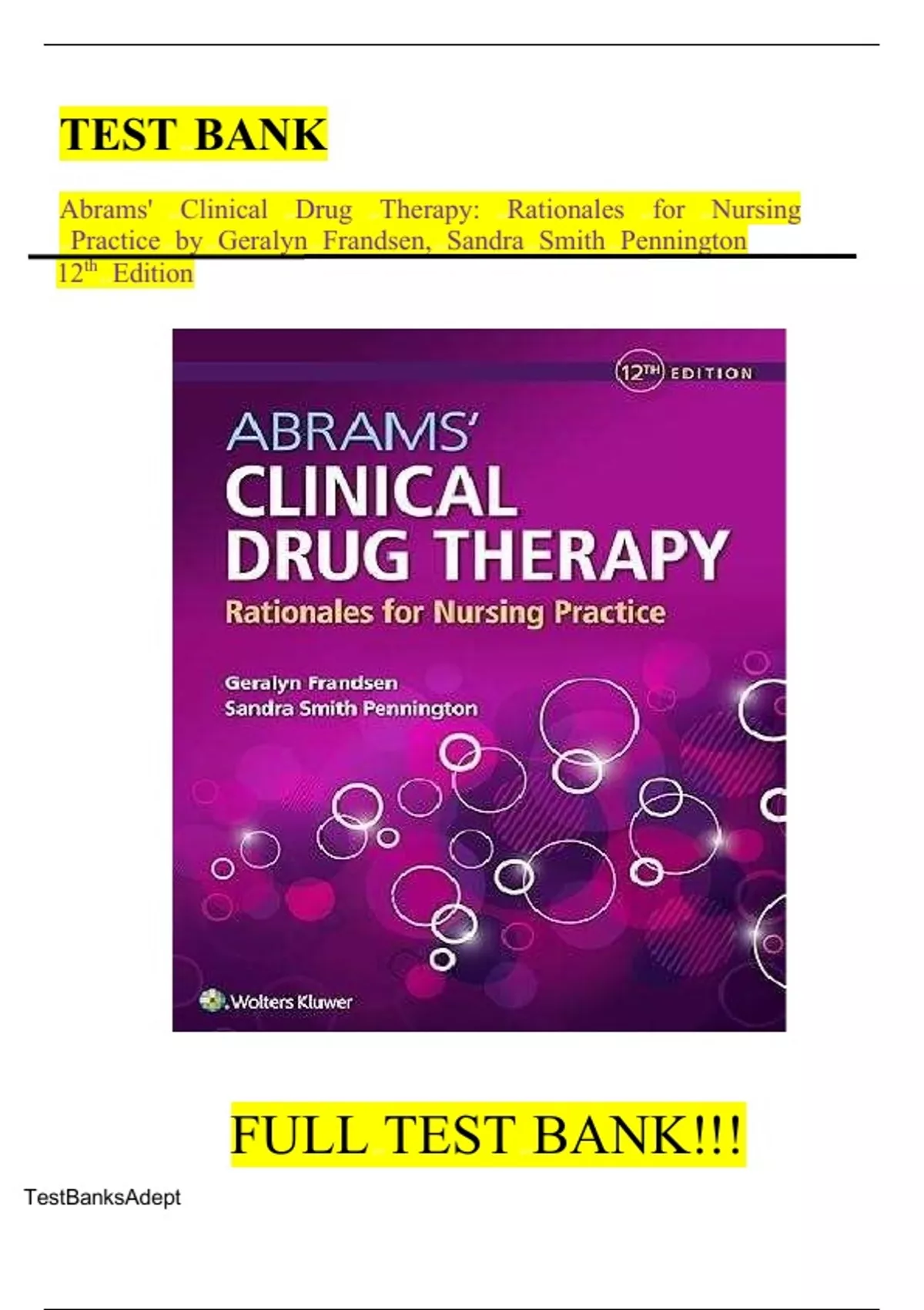 Test Bank For Abrams’ Clinical Drug Therapy Rationales for Nursing Practice 12th Edition Geralyn Frandsen ISBN:978-1975136130|1 - 61 Chapter With Rationals.||NEWEST VERSION||.