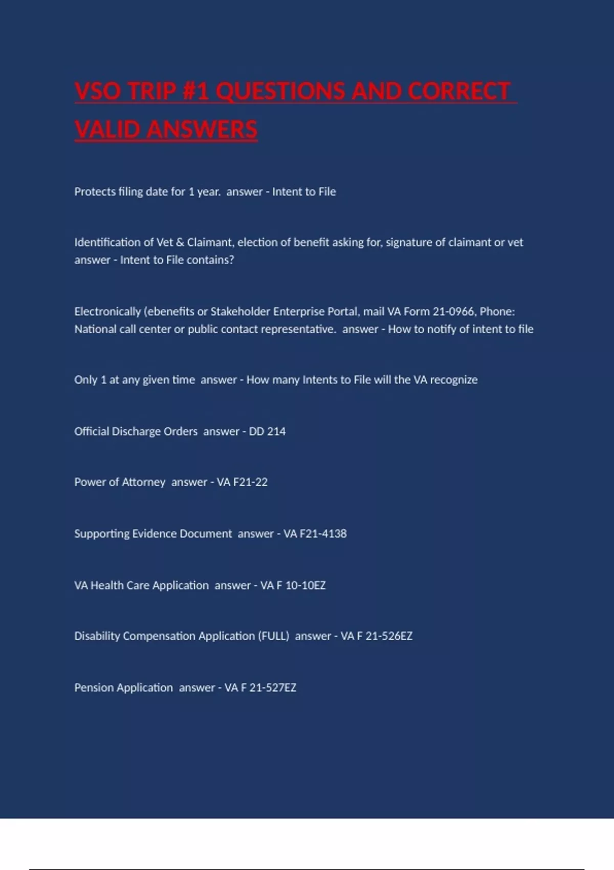 VSO TRIP #1 QUESTIONS AND CORRECT