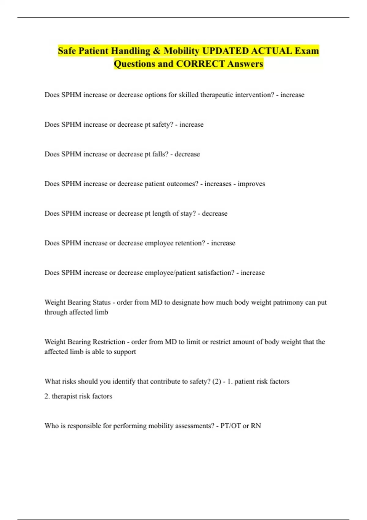 Safe Patient Handling & Mobility UPDATED ACTUAL Exam