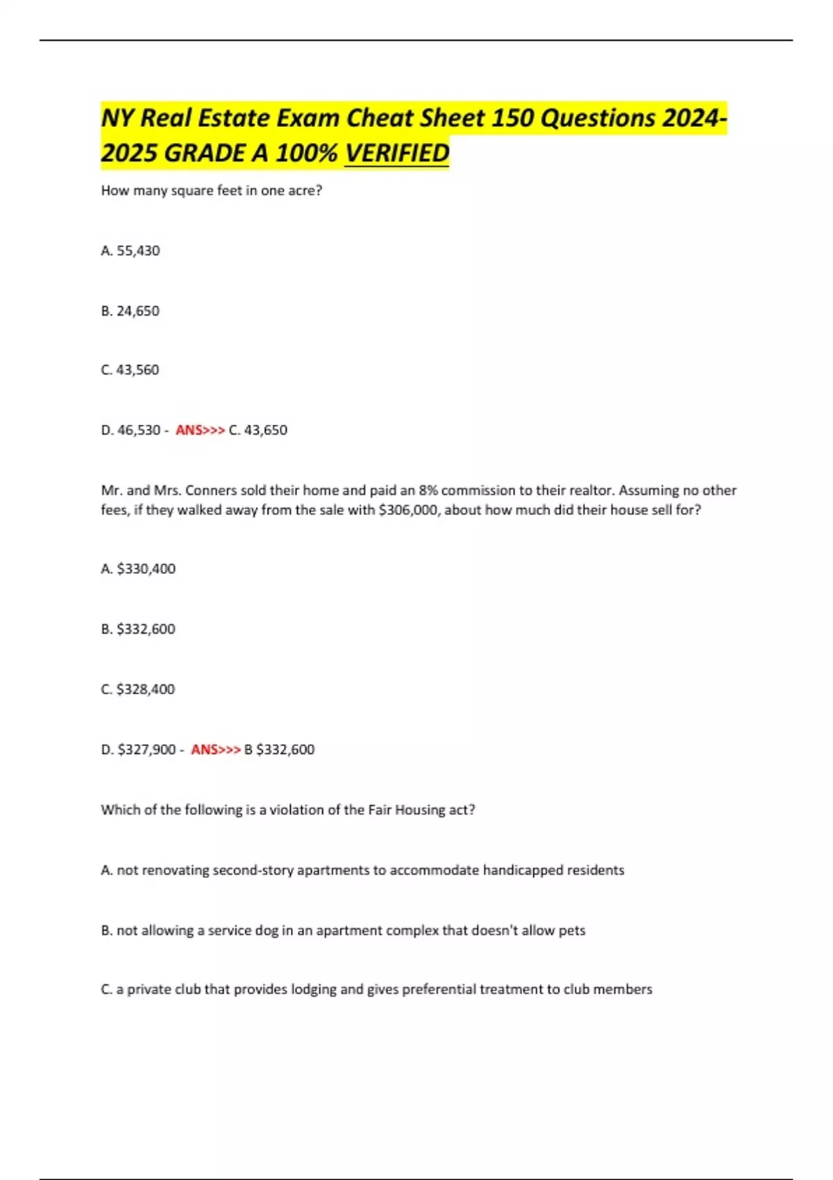 Ace your NY real estate exam with this 150-question cheat sheet! Updated for 2024, includes verified answers, key concepts, and practice questions. Instant download PDF.
