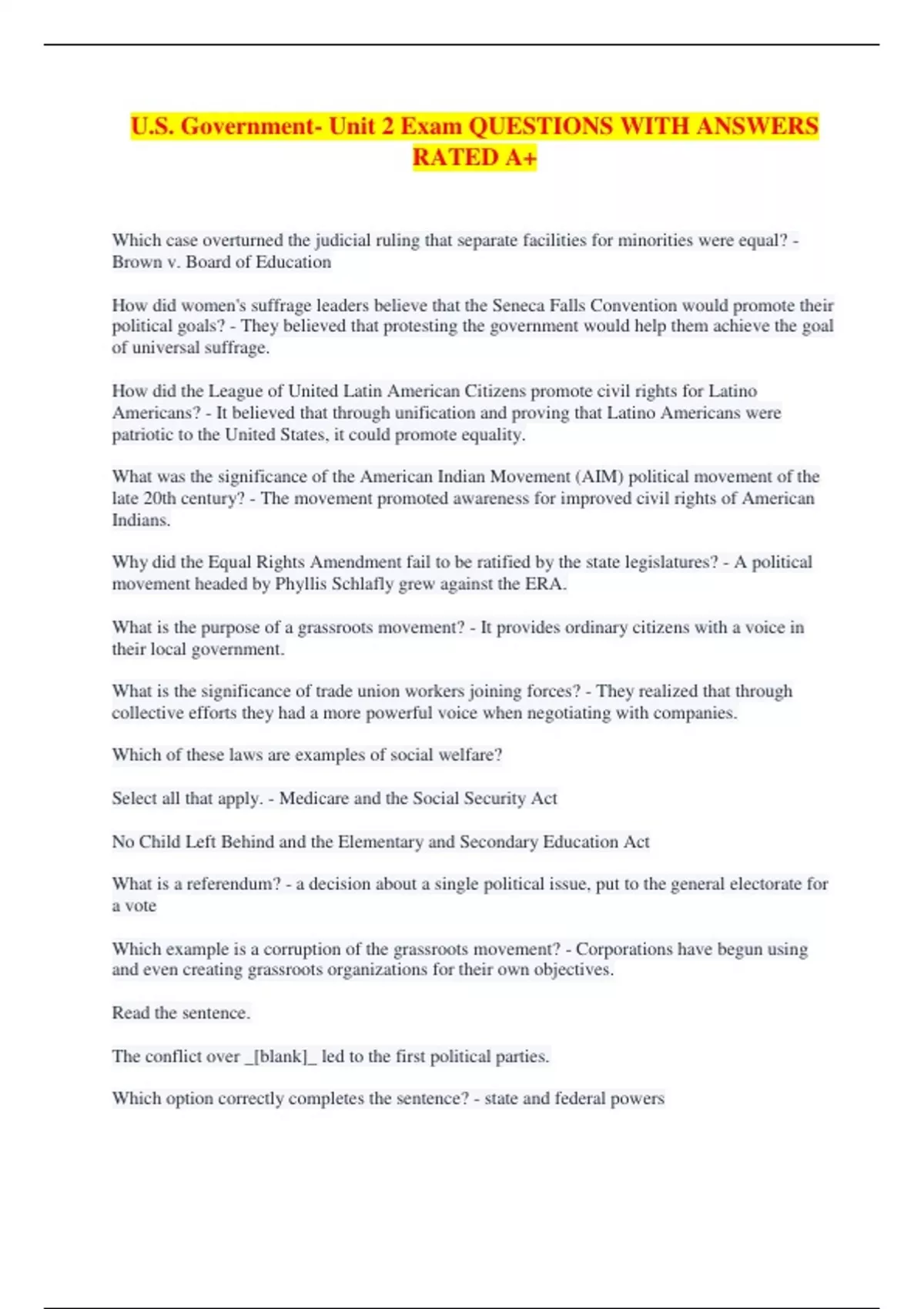 U.S. Government- Unit 2 Exam QUESTIONS WITH ANSWERS