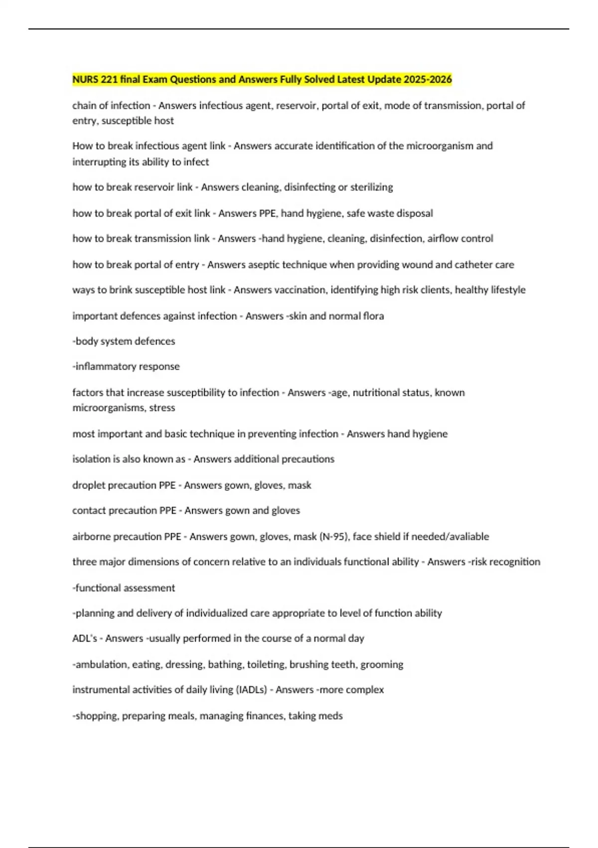 NURS 221 final Exam Questions and Answers Fully Solved Latest Update chain of infection - Answers infectious agent, reservoir, portal of exit, mode of transmission, portal of entry, susceptible host How to break infectious agent link - Answers accurate identification of the microorganism and interrupting its ability to infect how to break reservoir link - Answers cleaning, disinfecting or sterilizing how to break portal of exit link - Answers PPE, hand hygiene, safe waste disposal how to break transmission link - Answers -hand hygiene, cleaning, disinfection, airflow control how to break portal of entry - Answers aseptic technique when providing wound and catheter care ways to brink susceptible host link - Answers vaccination, identifying high risk clients, healthy lifestyle important defences against infection - Answers -skin and normal flora -body system defences -inflammatory response factors that increase susceptibility to infection - Answers -age, nutritional status, known microorganisms, stress most important and basic technique in preventing infection - Answers hand hygiene isolation is also known as - Answers additional precautions droplet precaution PPE - Answers gown, gloves, mask contact precaution PPE - Answers gown and gloves airborne precaution PPE - Answers gown, gloves, mask (N-95), face shield if needed/avaliable three major dimensions of concern relative to an individuals functional ability - Answers -risk recognition -functional assessment -planning and delivery of individualized care appropriate to level of function ability ADL's - Answers -usually performed in the course of a normal day -ambulation, eating, dressing, bathing, toileting, brushing teeth, grooming instrumental activities of daily living (IADLs) - Answers -more complex -shopping, preparing meals, managing finances, taking meds posture - Answers arrangement of the body in space body alignment - Answers the action of keeping the body in a state of normal position which side of the body should a cane be used on - Answers stronger side functional ability - Answers -Cognitive, social, physical, and emotional ability to carry out the normal activities of life represents continuum from full function to lack of function crutches are not usually used with - Answers older adults -no upper body strength patent safety - Answers pursuit of reduction and mitigation of unsafe acts within the healthcare system as well as use of best practices how to maintain proper body alignment - Answers widening your base of support and bringing the centre of gravity to the base of support fall - Answers results in a person coming to rest inadvertently on the ground or floor or other lower level with or without injury risk factors for fall - Answers -modifiable or non modifiable (age) -poor communication can also be a factor tools to identify patients that are at risk for falls - Answers -functional gait assessment -hendrich fall risk model II -St Thomas Assessment Tool -schmid fall risk assessment tool -more fall risk assessment if patient falls: - Answers -assess for injuries -monitor for injuries that may not be immediately apparent -determine factors that contributed to the fall -further assessments (vital signs, NVS)