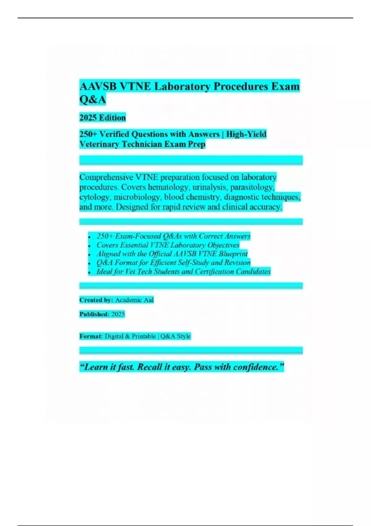 Ace the laboratory procedures section of the VTNE with this powerful 2025 exam prep guide featuring 250+ verified Q&As tailored to the Veterinary Technician National Examination (VTNE). Includes essential topics such as hematology, urinalysis, parasitology, cytology, microbiology, diagnostic tools, and specimen handling. Structured for fast recall and accurate review—ideal for independent study or class support. Whether you're reviewing last-minute or preparing thoroughly, this study tool gives you everything you need to pass the VTNE laboratory section with confidence.