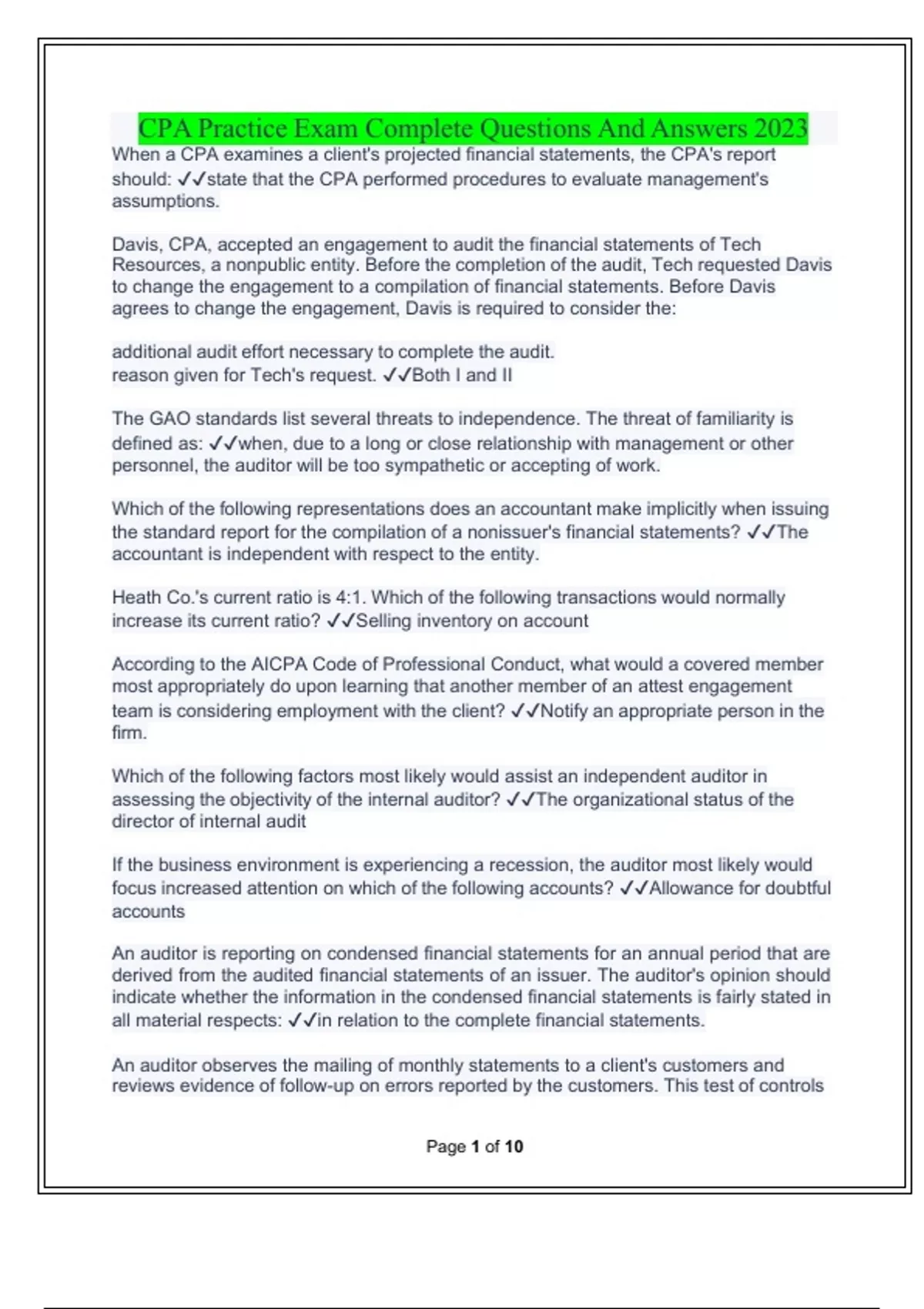 CPA Practice Exam Complete Questions And AnswersWhen a CPA examines a client's projected financial statements, the CPA's report should: state that the CPA performed procedures to evaluate management's assumptions. Davis, CPA, accepted an engagement to audit the financial statements of Tech Resources, a nonpublic entity. Before the completion of the audit, Tech requested Davis to change the engagement to a compilation of financial statements. Before Davis agrees to change the engagement, Davis is required to consider the: additional audit effort necessary to complete the audit. reason given for Tech's request. Both I and II The GAO standards list several threats to independence. The threat of familiarity is defined as: when, due to a long or close relationship with management or other personnel, the auditor will be too sympathetic or accepting of work. Which of the following representations does an accountant make implicitly when issuing the standard report for the compilation of a nonissuer's financial statements? The accountant is independent with respect to the entity. Heath Co.'s current ratio is 4:1. Which of the following transactions would normally increase its current ratio? Selling inventory on account According to the AICPA Code of Professional Conduct, what would a covered member most appropriately do upon learning that another member of an attest engagement team is considering employment with the client? Notify an appropriate person in the firm. Which of the following factors most likely would assist an independent auditor in assessing the objectivity of the internal auditor? The organizational status of the director of internal audit If the business environment is experiencing a recession, the auditor most likely would focus increased attention on which of the following accounts? Allowance for doubtful accounts An auditor is reporting on condensed financial statements for an annual period that are derived from the audited financial statements of an issuer. The auditor's opinion should indicate whether the information in the condensed financial statements is fairly stated in all material respects: in relation to the complete financial statements. An auditor observes the mailing of monthly statements to a client's customers and reviews evidence of follow-up on errors reported by the customers. This test of controls Page 2 of 10 most likely is performed to support management's financial statement assertion of: existence. North Co., a privately held entity, asked its tax accountant, King, a CPA in public practice, to review and generate North's interim financial statements on King's microcomputer when King prepared North's quarterly tax return. King should not submit these financial statements to North unless, as a minimum, King complies with the provisions of: Statements on Standards for Accounting and Review Services. An auditor's report would be designated an audit of a special-purpose financial statement when it is issued in connection with: a basis of accounting that the entity uses to comply with an agreement between the entity and one or more third parties other than the auditor. An auditor most likely would not rely on controls if the payroll department supervisor is responsible for: authorizing payroll rate changes for all employees. Which of the following levels would most likely address the risk of material misstatement by the auditor's consideration of an entity's control environment? Financial statements Which of the following would most likely be associated with obtaining an understanding of relevant internal factors when satisfying the obligation to understand the entity and its environment on an audit? Revenue recognition practices Russell CPA is auditing contingent liabilities. What generally is the primary risk of material misstatement related to related financial statement disclosures? Completeness Nile, CPA, on completing an audit, was asked by the client to provide technical assistance in integrating a new IT system. The set of pronouncements designed to guide Nile in this engagement is the Statement(s) on: Standards for Consulting Services. Investment and property schedules are presented for purposes of additional analysis in an auditor-submitted document. The schedules are not required parts of the basic financial statements but accompany the basic financial statements. When reporting on such additional information, the measurement of materiality is the: same as that used in forming an opinion on the basic financial statements taken as a whole. Which of the following is required of an accountant in reviewing a company's financial statements under the Statements on Standards for Accounting and Review Services (SSARS)? Obtain knowledge of the client's industry Analytical procedures are required for which of the following? Audit planning Page 3 of 10 In planning an audit, the auditor's knowledge about the design of relevant control activities should be used to: identify the types of potential misstatements that could occur. A CPA firm is completing the fieldwork for an audit of Swenson Co. for the current year ended December 31. The manager in charge of the audit is performing the final steps in the evidence accumulation phase of the audit and notes that there have been several changes in Swenson during the year under audit. Which of the following items would indicate there could be substantial doubt about Swenson's ability to continue as a going concern for a reasonable period of time? Recurring working capital shortages