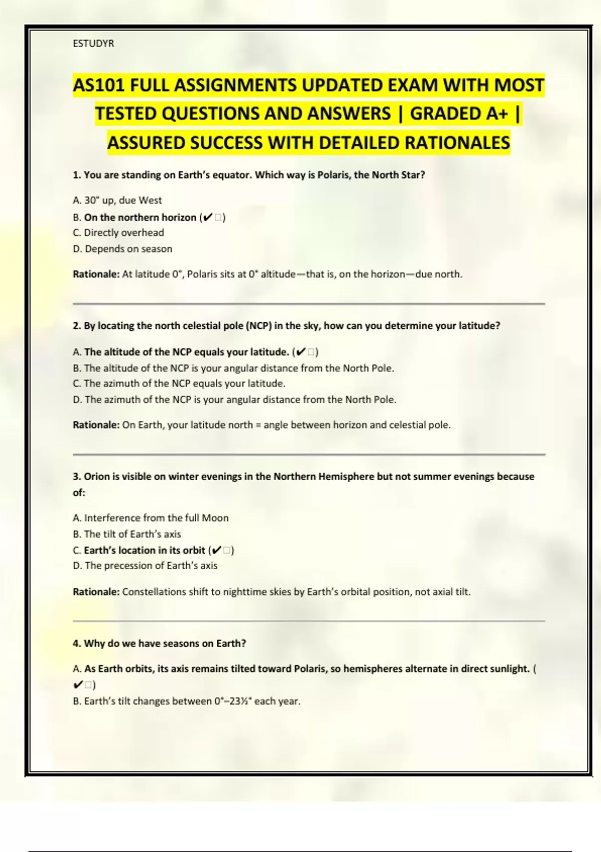 1. You are standing on Earth’s equator. Which way is Polaris, the North Star?