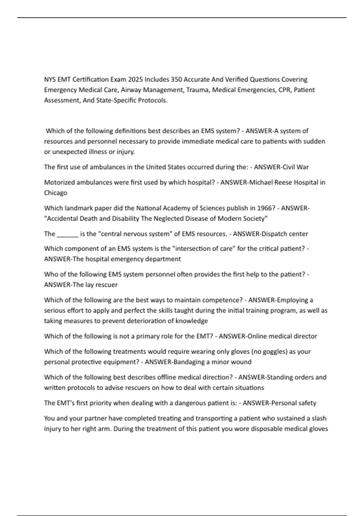 NYS EMT Certification Exam 2025 Includes 350 Accurate And Verified Questions Covering