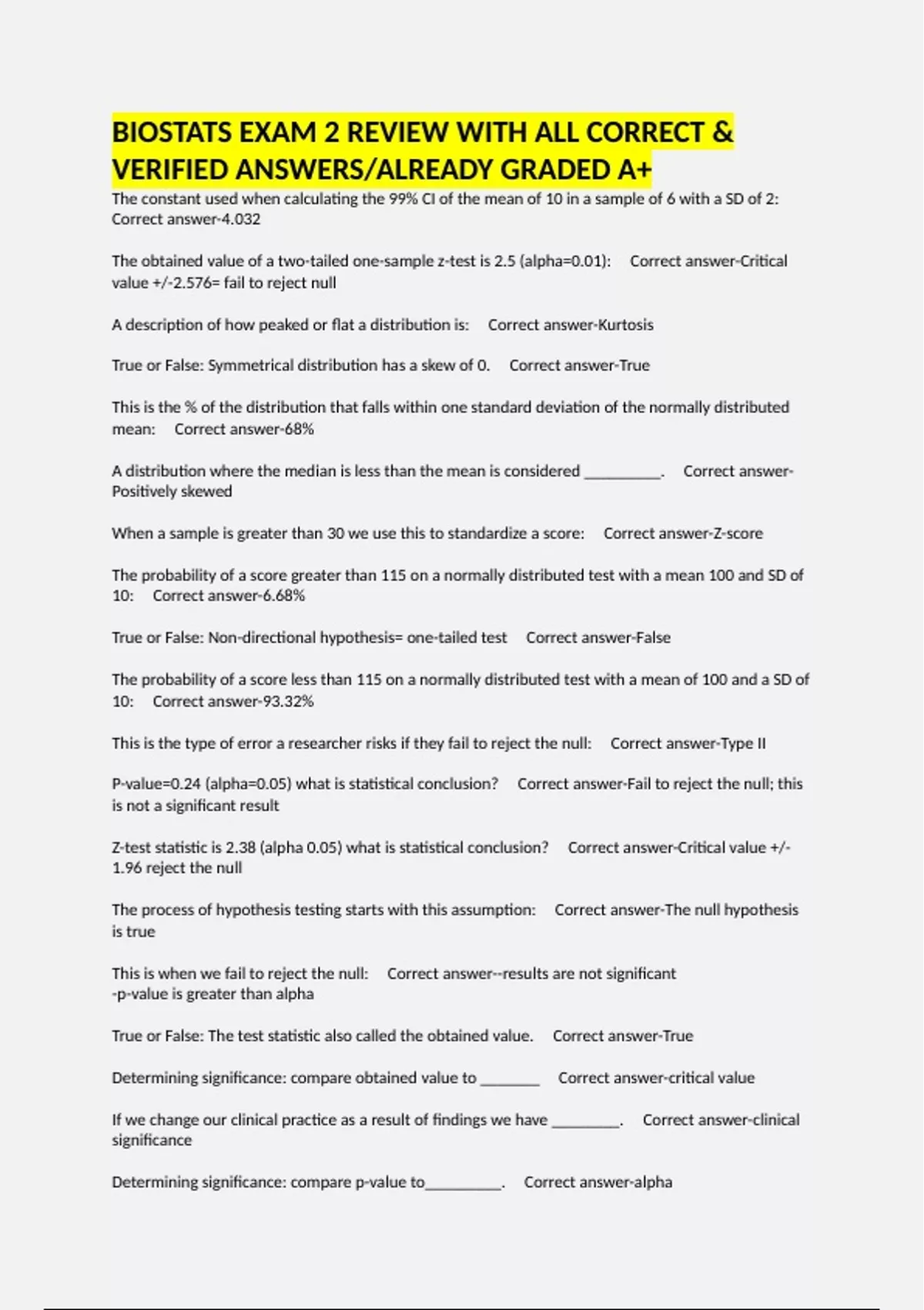BIOSTATS EXAM 2 REVIEW WITH ALL CORRECT & VERIFIED ANSWERS/ALREADY GRADED A+