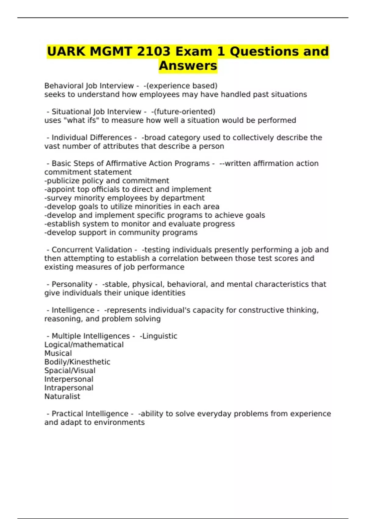 UARK MGMT 2103 Exam 1 Questions and Answers