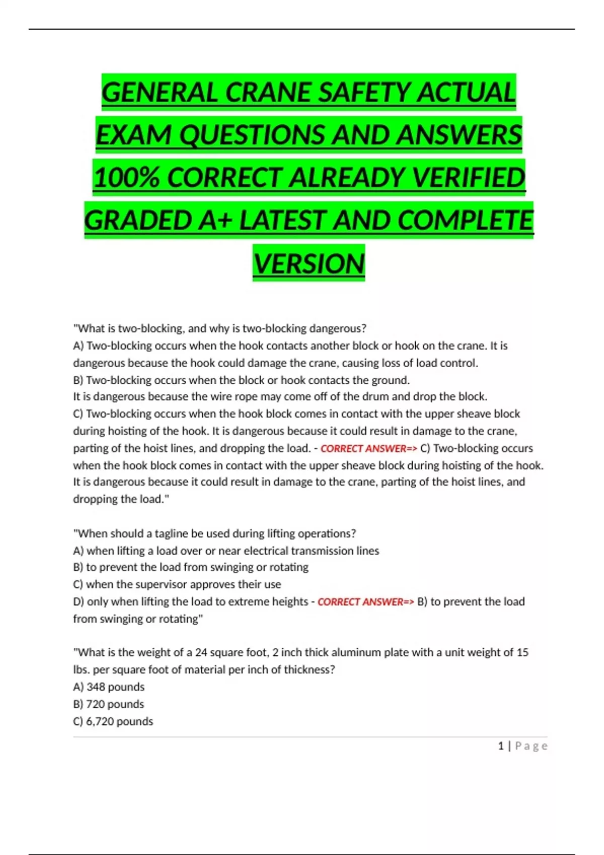 GENERAL CRANE SAFETY ACTUAL EXAM QUESTIONS AND ANSWERS 100% CORRECT ALREADY VERIFIED GRADED A+ LATEST AND COMPLETE VERSION