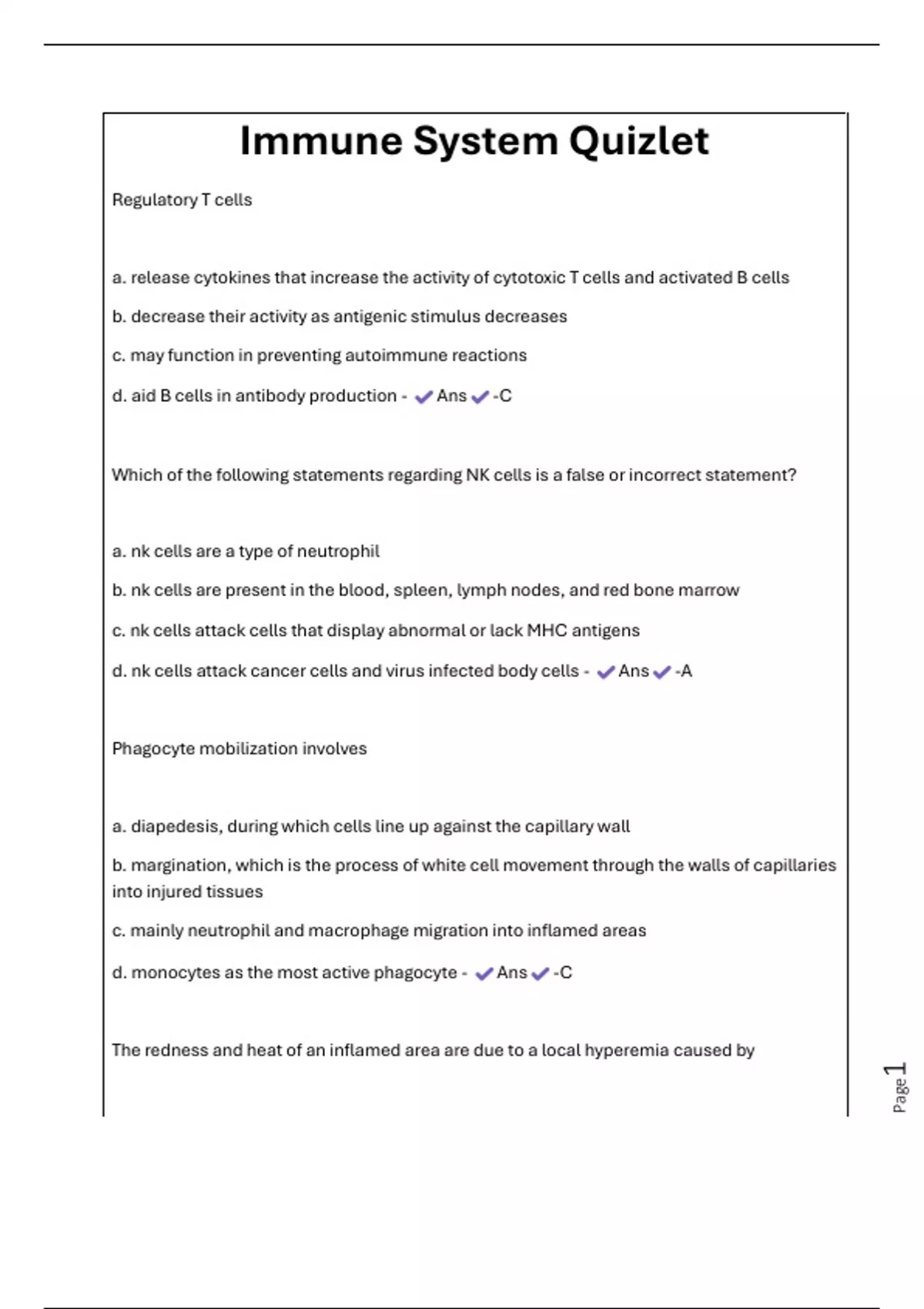 Immune System Quizlet Regulatory T cells a. release cytokines that increase the activity of cytotoxic T cells and activated B cells b. decrease their activity as antigenic stimulus decreases c. may function in preventing autoimmune reactions d. aid B cells in antibody production - Ans -C Which of the following statements regarding NK cells is a false or incorrect statement? a. nk cells are a type of neutrophil b. nk cells are present in the blood, spleen, lymph nodes, and red bone marrow c. nk cells attack cells that display abnormal or lack MHC antigens d. nk cells attack can