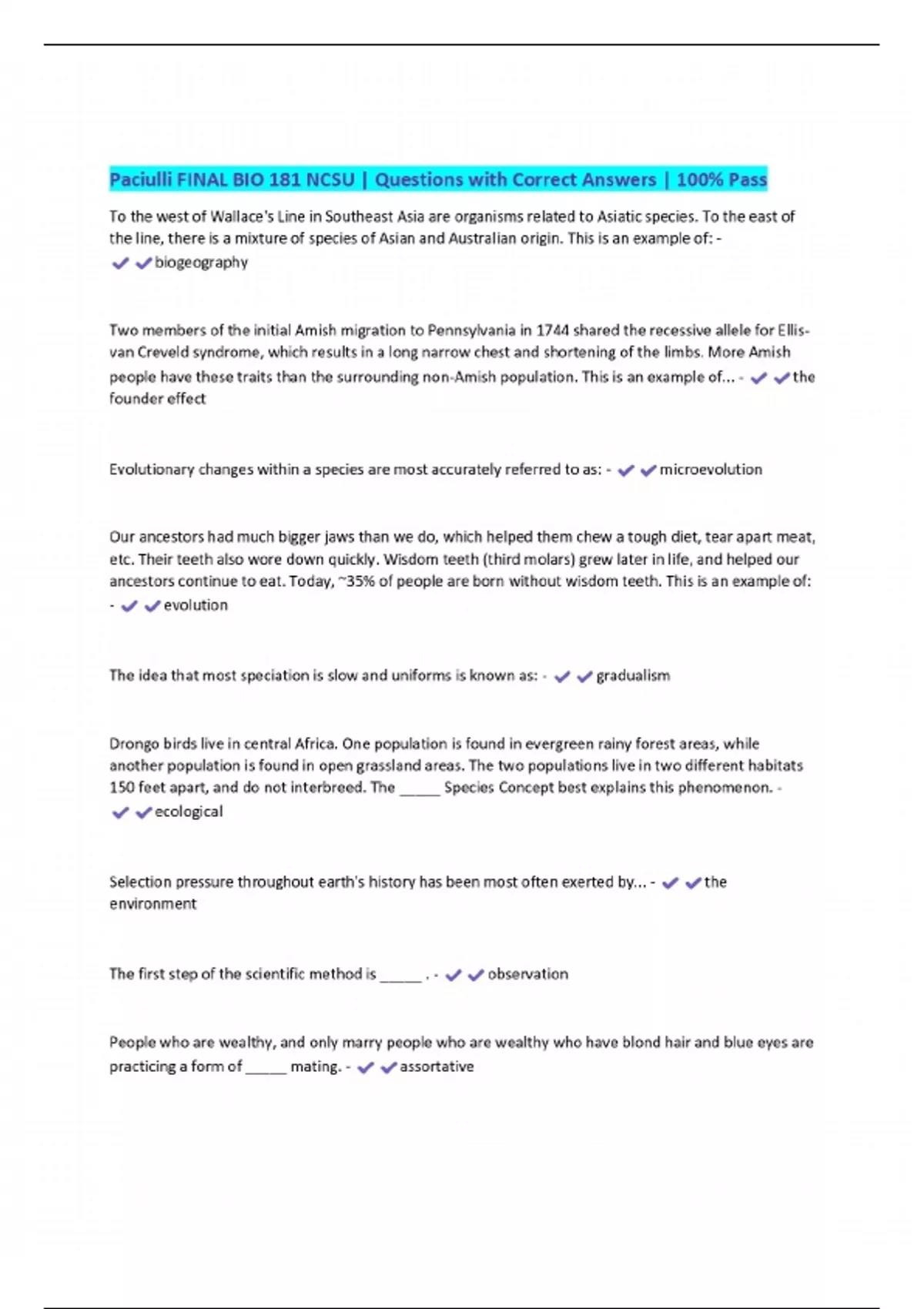 Paciulli FINAL BIO 181 NCSU | Questions with Correct Answers | 100% Pass