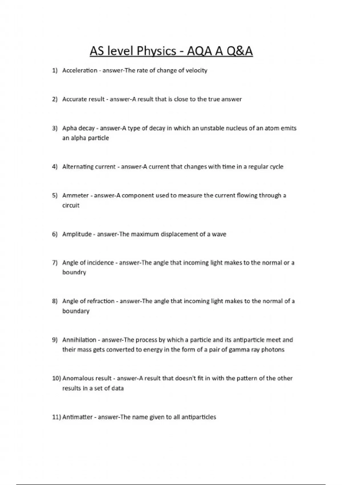 AS level Physics - AQA A Q&A 1) Acceleration - answer-The rate of change of velocity 2) Accurate result - answer-A result that is close to the true answer 3) Apha decay - answer-A type of decay in which an unstable nucleus of an atom emits an alpha particle 4) Alternating current - answer-A current that changes with time in a regular cycle 5) Ammeter - answer-A component used to measure the current flowing through a circuit 6) Amplitude - answer-The maximum displacement of a wave 7) Angle of incidence - answer-The angle that incoming light makes to the normal or a boundry 8) Angle of refraction - answer-The angle that incoming light makes to the normal of a boundary 9) Annihilation - answer-The process by which a particle and its antiparticle meet and their mass gets converted to energy in the form of a pair of gamma ray photons 10) Anomalous result - answer-A result that doesn't fit in with the pattern of the other results in a set of data 11) Antimatter - answer-The name given to all antiparticles
