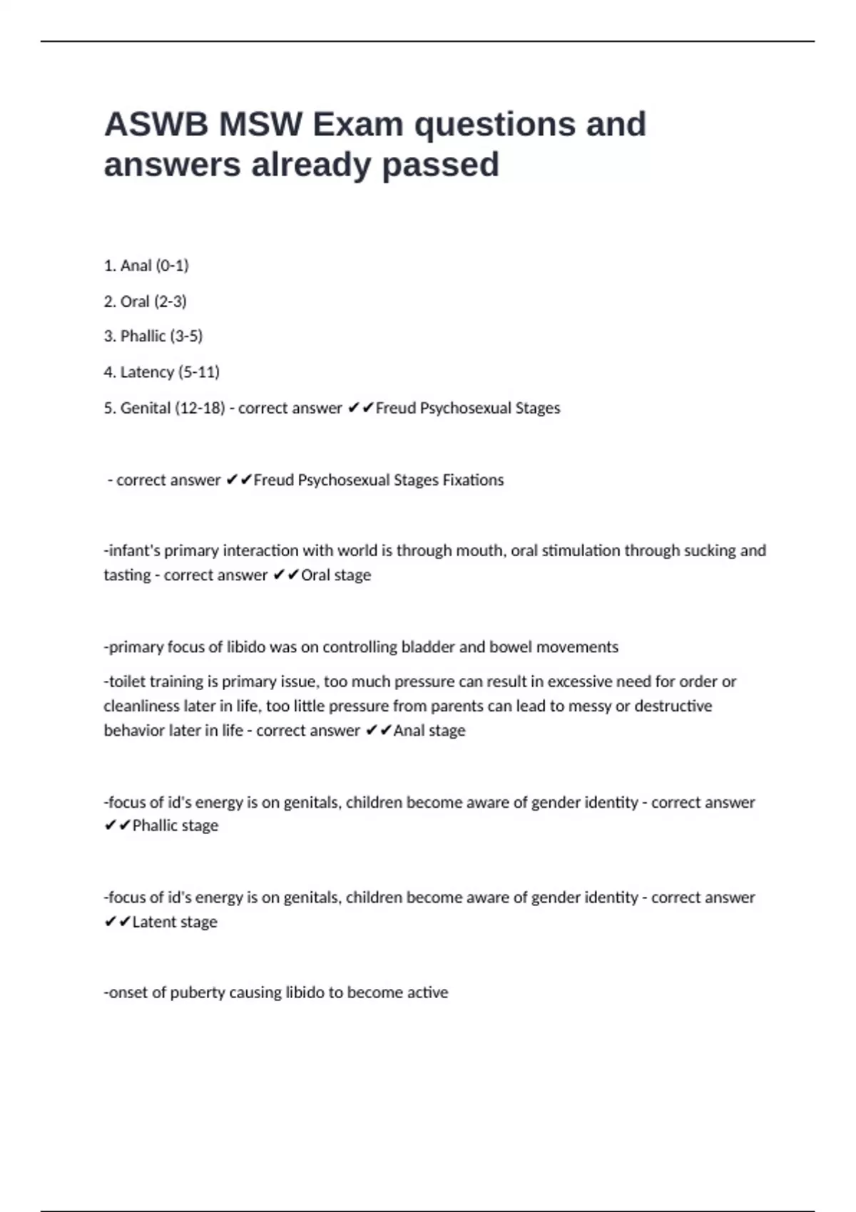 - correct answer ✔✔Freud Psychosexual Stages Fixations
