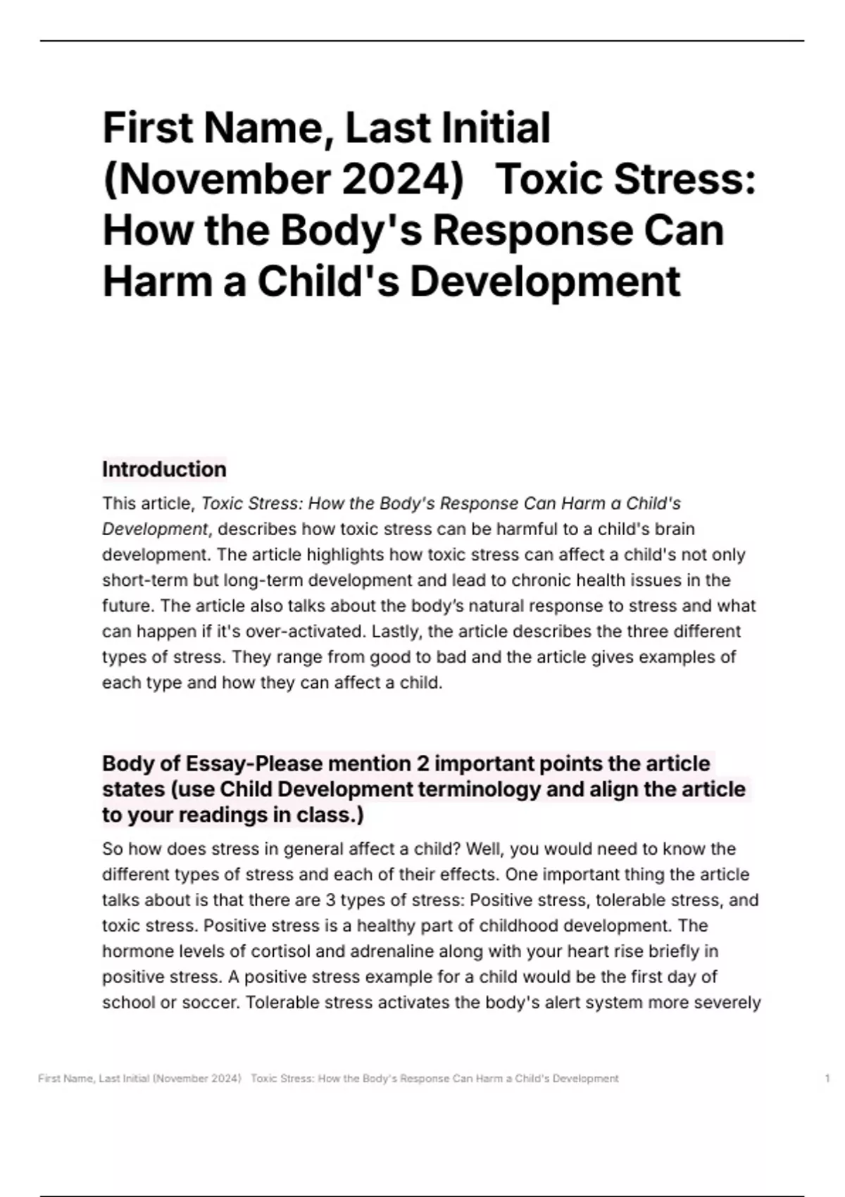 First Name, Last Initial (November 2024) Toxic Stress: How the Body's Response Can Harm a Child's Development 1