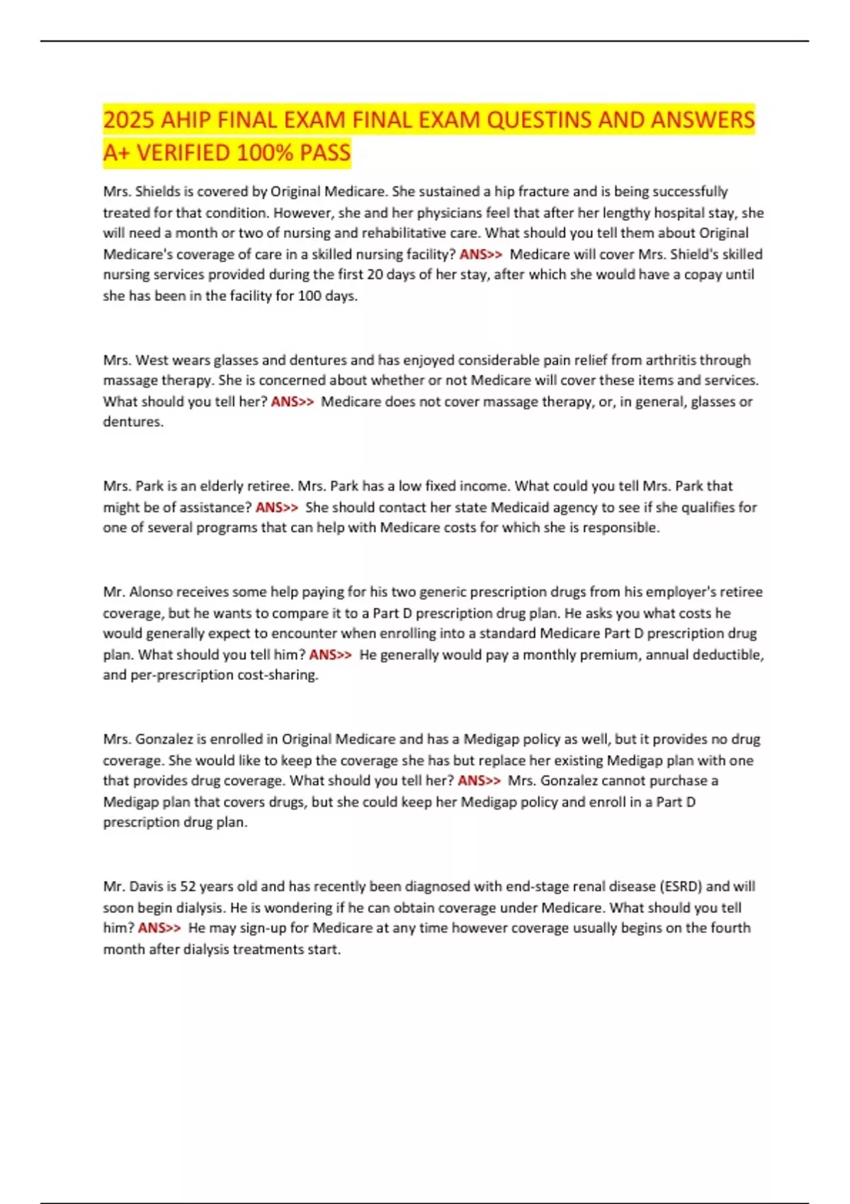 This document contains the complete set of questions and correct answers for the 2025 AHIP Final Exam, covering all key topics required for Medicare agent certification. It includes detailed scenarios on Medicare Parts A, B, C (Medicare Advantage), and D (Prescription Drug Plans), enrollment periods, Medigap, Special Needs Plans (SNPs), compliance rules, and the Medicare Prescription Payment Plan. Verified for accuracy and structured to ensure exam success.