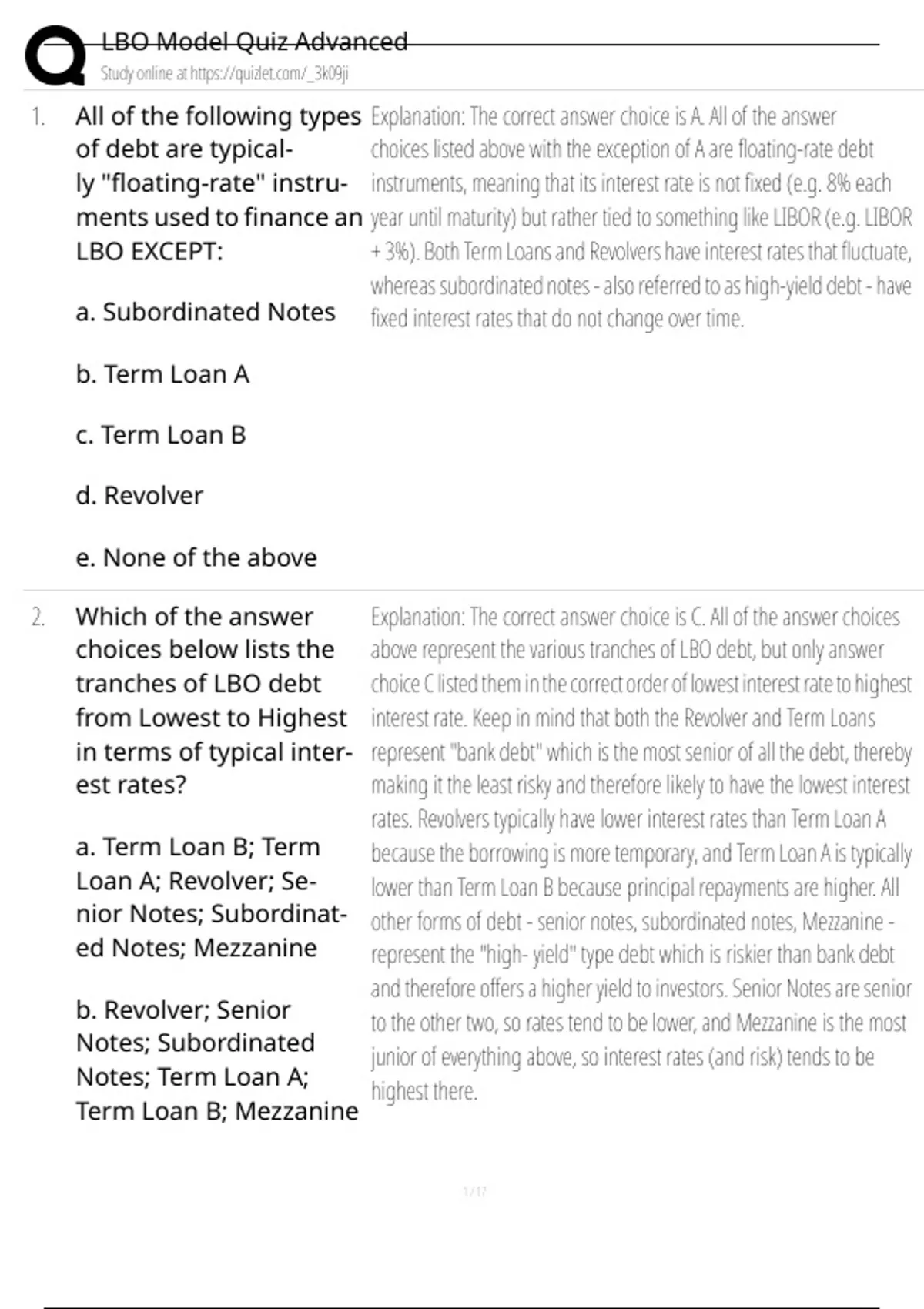 tranches of LBO debt choice C listed them in the correct order of lowest interest rate to highest