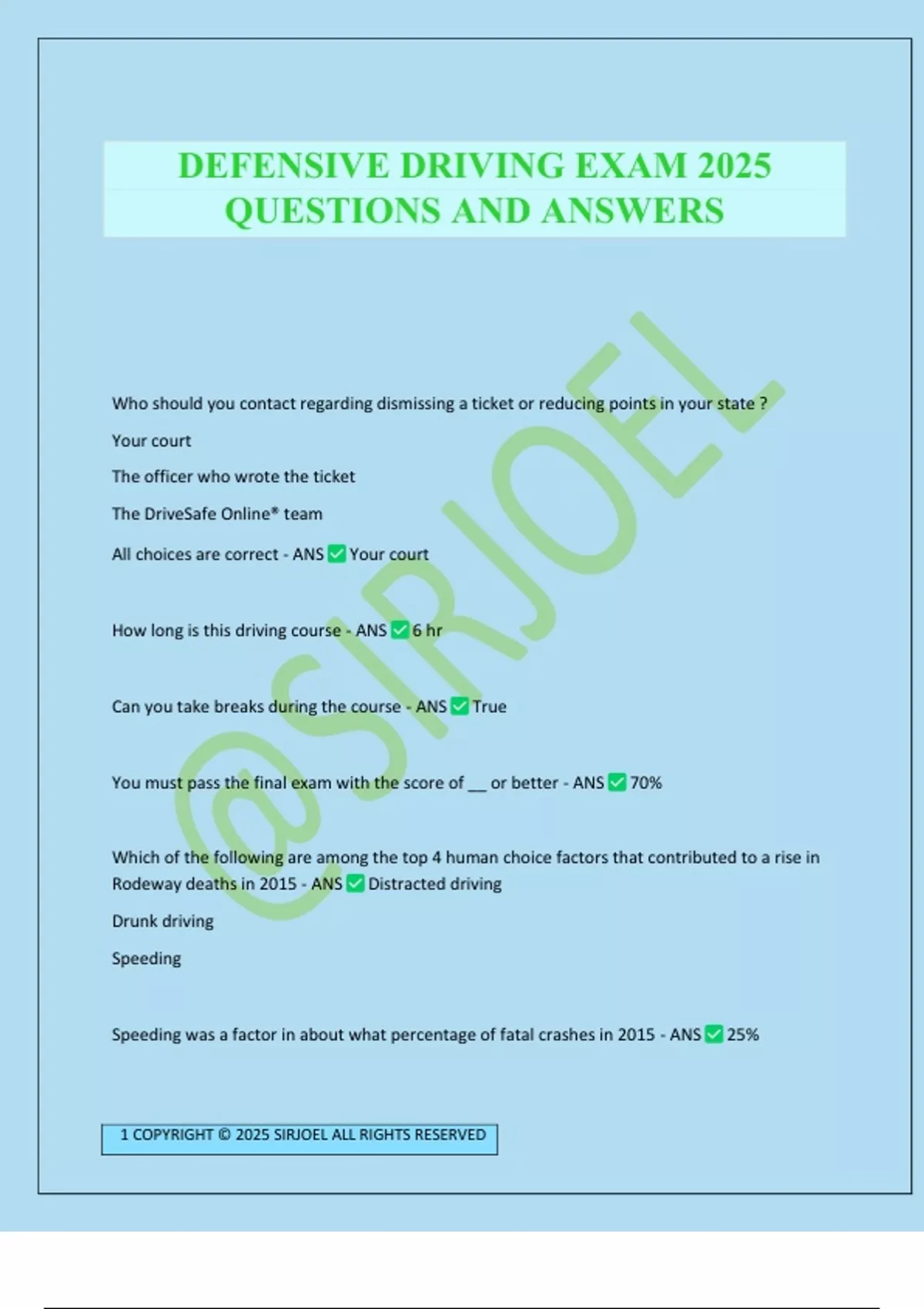 Who should you contact regarding dismissing a ticket or reducing points in your state ? Your court The officer who wrote the ticket The DriveSafe Online® team All choices are correct - ANS Your court How long is this driving course - ANS 6 hr Can you take breaks during the course - ANS True You must pass the final exam with the score of __ or better - ANS 70% Which of the following are among the top 4 human choice factors that contributed to a rise in Rodeway deaths in 2015 - ANS Distracted driving Drunk driving Speeding Speeding was a factor in about what percentage of fatal crashes in 2015 - ANS 25% 2 COPYRIGHT © 2025 SIRJOEL ALL RIGHTS RESERVED What is the leading cause of death for people age 16 to 24 - ANS Traffic accidents About __ percent of all fatally injured passengers in passenger vehicles were not wearing a seatbelt in 2015 - ANS 50% Which of the following is an example of economic loss? Workplace losses Medical expenses Property damage All choices are correct - ANS All choices are correct Which of the following is not a recommendation for dealing with an aggressive driver - ANS Maintain your lane when being followed closely Select all the emotional states that may affect your driving - ANS Stress Anger Sadness anxiety What is the legal limit for blood alcohol concentration - ANS .08% The following drugs are found to have no effect on driver performance - ANS All drugs have an effect Which of the following are effects of drowsy driving An inability to recall the last few miles traveled Having disconnecte
