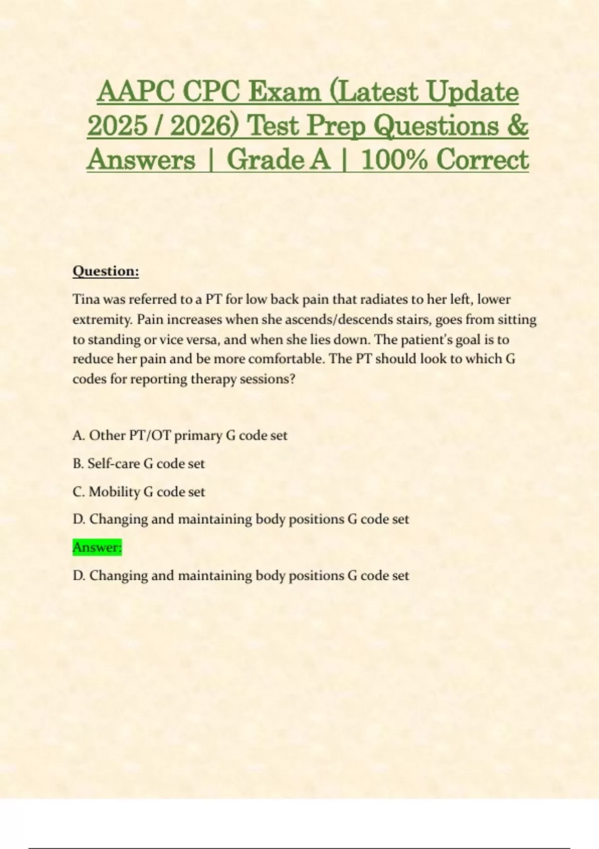reduce her pain and be more comfortable. The PT should look to which G