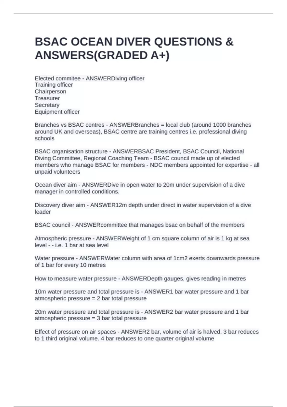 BSAC OCEAN DIVER QUESTIONS & ANSWERS(GRADED A+)