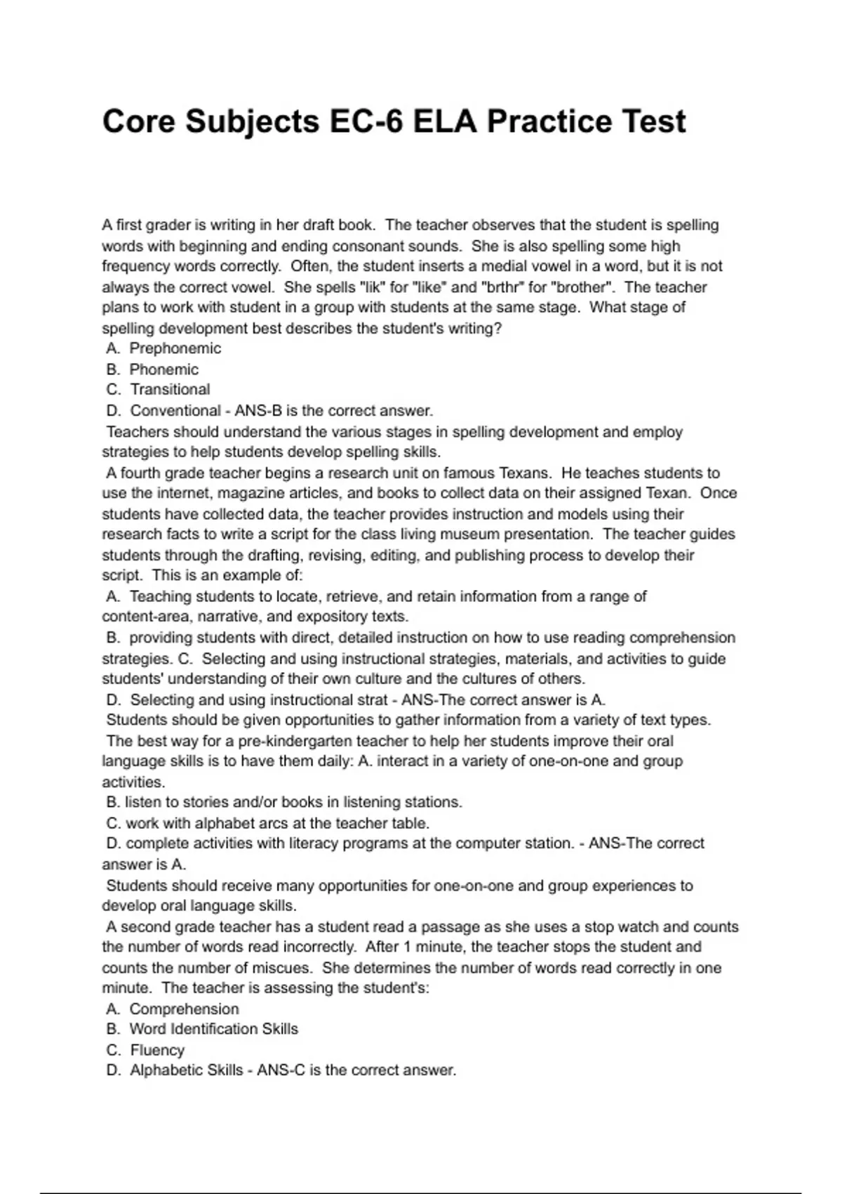 Core Subjects EC-6 ELA Practice Test NEWEST 2025/2026 ACTUAL EXAM COMPLETE QUESTIONS AND CORRECT DETAILED ANSWERS (VERIFIED ANSWERS) |ALREADY GRADED A+||BRAND NEW!!