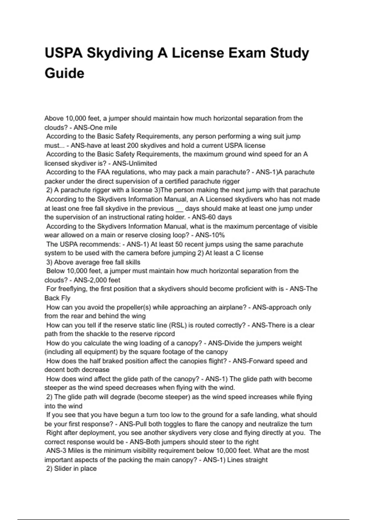 USPA Skydiving A License Exam Study Guide NEWEST 2025/2026 ACTUAL EXAM COMPLETE QUESTIONS AND CORRECT DETAILED ANSWERS (VERIFIED ANSWERS) |ALREADY GRADED A+||BRAND NEW!!