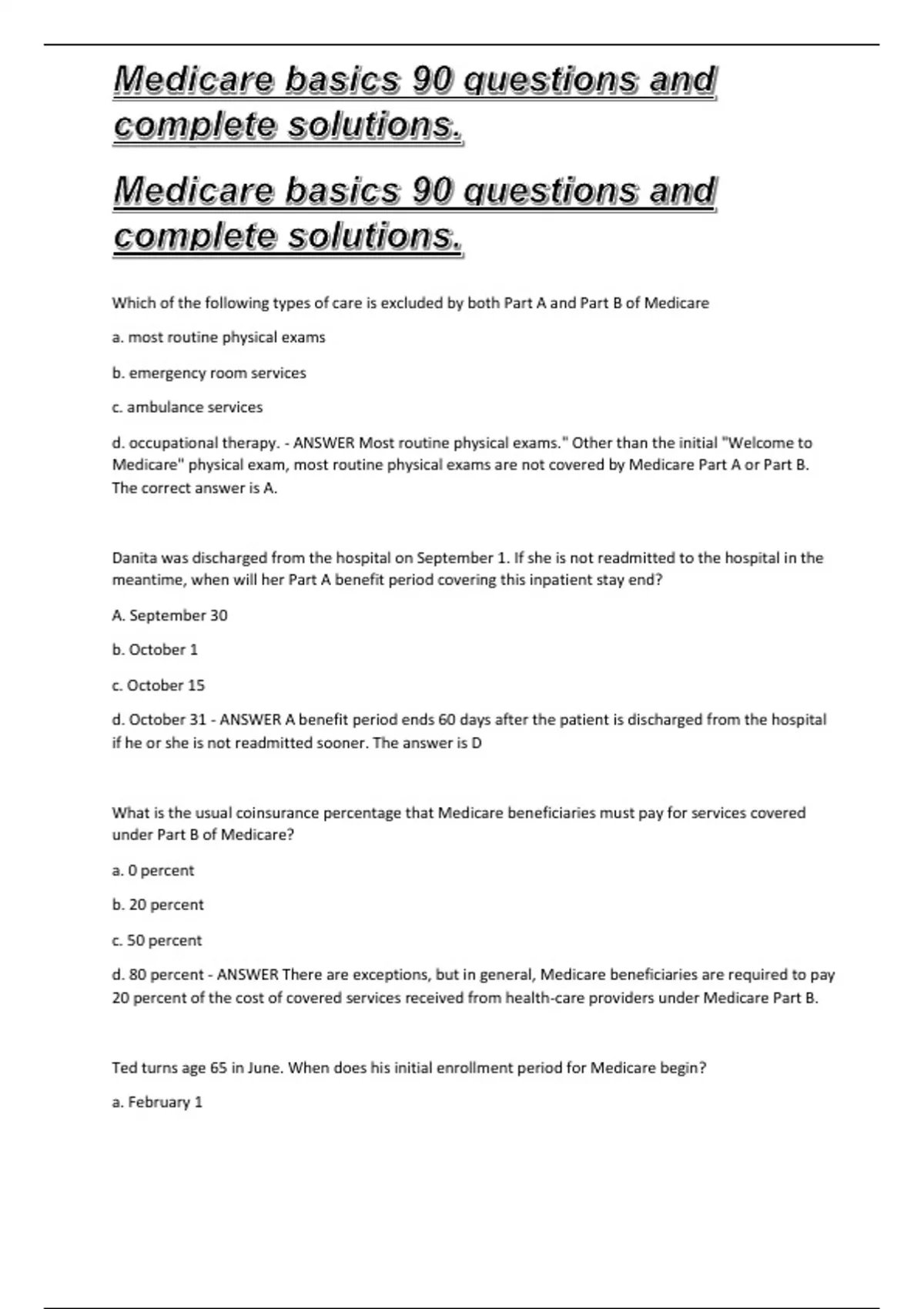Medicare basics 90 questions and complete solutions. Medicare basics 90 questions and complete solutions. Medicare basics 90 questions and complete solutions. Medicare basics 90 questions and complete solutions. Medicare basics 90 questions and complete solutions. Medicare basics 90 questions and complete solutions.