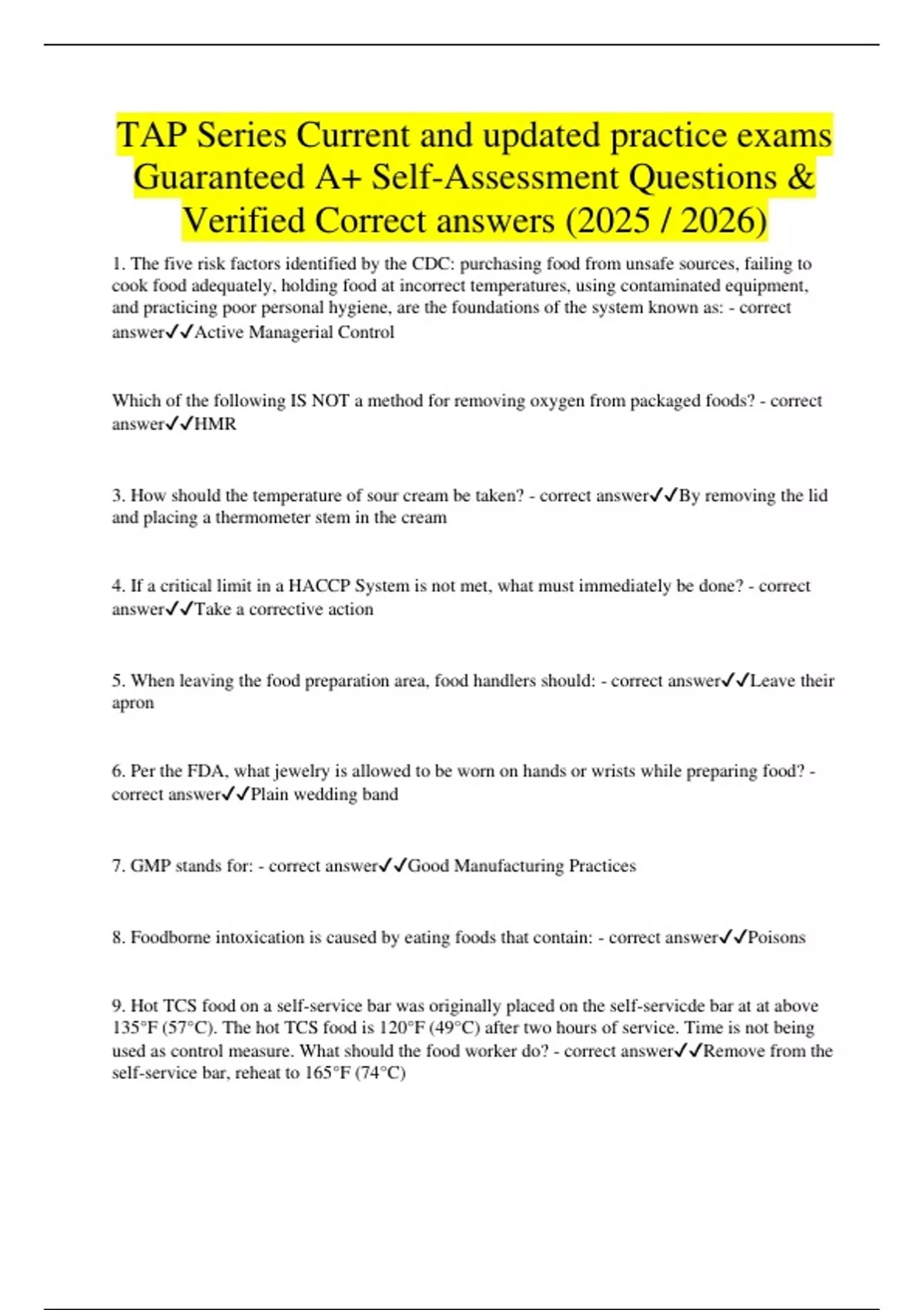 TAP Series Current and updated practice exams Guaranteed A+ Self-Assessment Questions & Verified Correct answers (2025 / 2026) 1. The five risk factors identified by the CDC: purchasing food from unsafe sources, failing to cook food adequately, holding food at incorrect temperatures, using contaminated equipment, and practicing poor personal hygiene, are the foundations of the system known as: - correct answerActive Managerial Control Which of the following IS NOT a method for removing oxygen from packaged foods? - correct answerHMR 3. How should the temperature of sour cream be taken? - correct answerBy removing the lid and placing a thermometer stem in the cream 4. If a critical limit in a HACCP System is not met, what must immediately be done? - correct answerTake a corrective action
