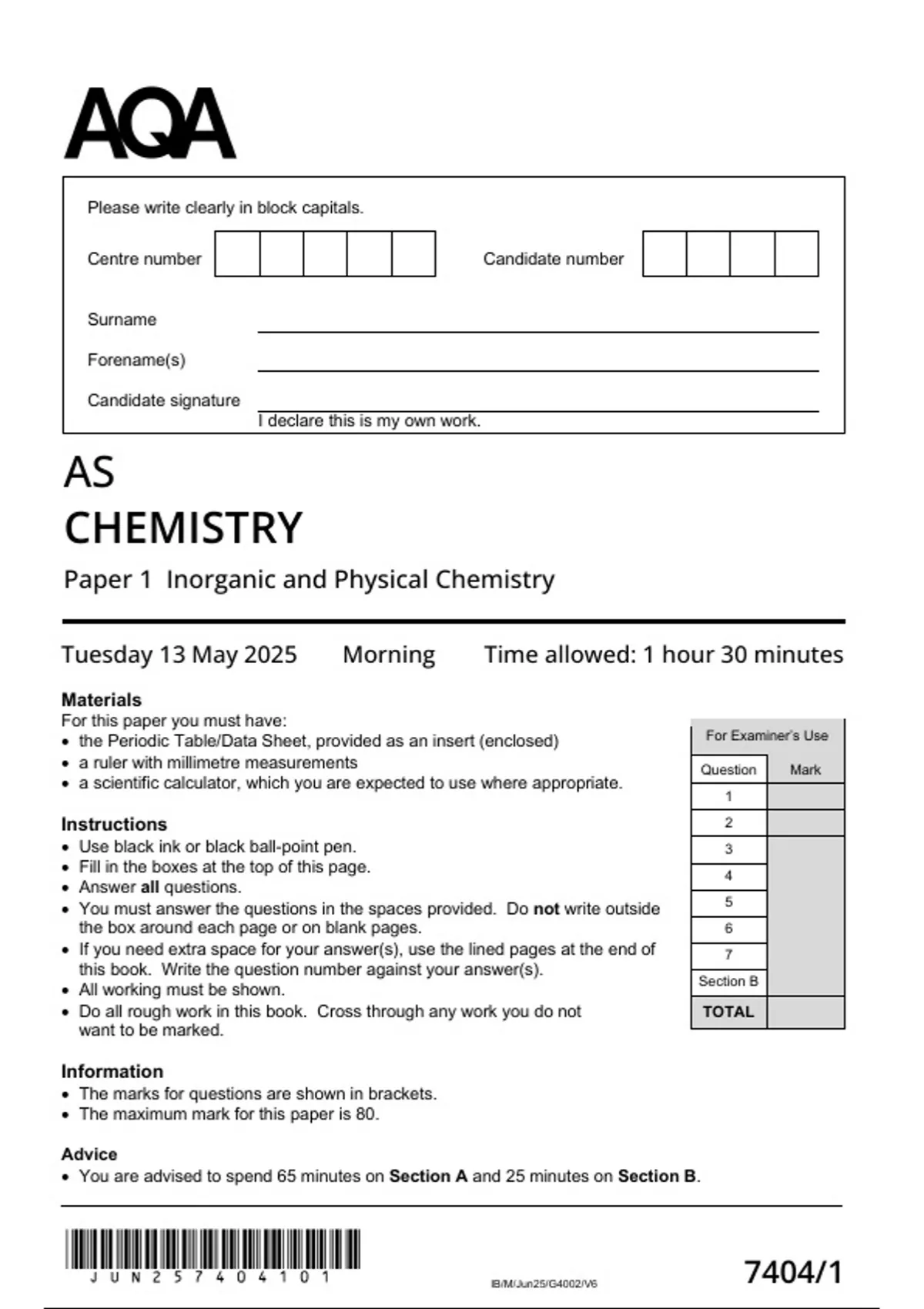 AQA AS Level Chemistry 2025 Paper 1 Question Paper