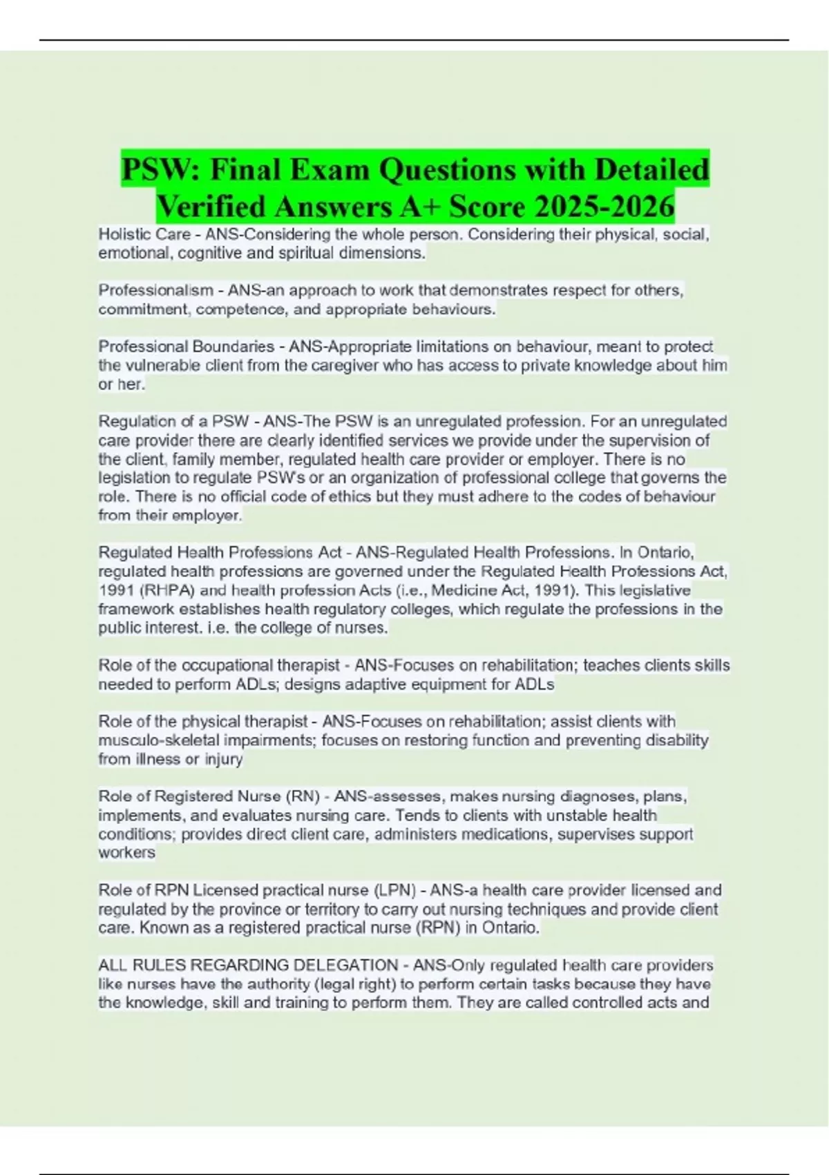 PSW: Final Exam Questions with Detailed Verified Answers A+ Score Holistic Care - ANS-Considering the whole person. Considering their physical, social, emotional, cognitive and spiritual dimensions. Professionalism - ANS-an approach to work that demonstrates respect for others, commitment, competence, and appropriate behaviours. Professional Boundaries - ANS-Appropriate limitations on behaviour, meant to protect the vulnerable client from the caregiver who has access to private knowledge about him or her. Regulation of a PSW - ANS-The PSW is an unregulated profession. For an unregulated care provider there are clearly identified services we provide under the supervision of the client, family member, regulated health care provider or employer. There is no legislation to regulate PSW's or an organization of professional college that governs the role. There is no official code of ethics but they must adhere to the codes of behaviour from their employer. Regulated Health Professions Act - ANS-Regulated Health Professions. In Ontario, regulated health professions are governed under the Regulated Health Professions Act, 1991 (RHPA) and health profession Acts (i.e., Medicine Act, 1991). This legislative framework establishes health regulatory colleges, which regulate the professions in the public interest. i.e. the college of nurses. Role of the occupational therapist - ANS-Focuses on rehabilitation; teaches clients skills needed to perform ADLs; designs adaptive equipment for ADLs Role of the physical therapist - ANS-Focuses on rehabilitation; assist clients with musculo-skeletal impairments; focuses on restoring function and preventing disability from illness or injury Role of Registered Nurse (RN) - ANS-assesses, makes nursing diagnoses, plans, implements, and evaluates nursing care. Tends to clients with unstable health conditions; provides direct client care, administers medications, supervises support workers Role of RPN Licensed practical nurse (LPN) - ANS-a health care provider licensed and regulated by the province or territory to carry out nursing techniques and provide client care. Known as a registered practical nurse (RPN) in Ontario. ALL RULES REGARDING DELEGATION - ANS-Only regulated health care providers like nurses have the authority (legal right) to perform certain tasks because they have the knowledge, skill and training to perform them. They are called controlled acts and are considered harmful if they are performed by unqualified people. In some circumstances some acts will be delegated to you. In order to do this, specific conditions called "exceptions" must be met for delegation to be permitted. The nurse must feel confident the support worker understands what the responsibilities are when performing the task, knowns when and who to ask for assistance, and knowns when, how and whom to report the outcome of the task. Tasks that may be delegated to support workers must be routine ones with predictable outcomes that require little supervision and can only be delegated for stable clients. Delegation tasks may include: suctioning a permanent tracheotomy in and out catheterization; administering glucometers, dressings, tube feedings and medication. Only some nursing tasks can be delegated. Your employer's policies and guidelines, your job description and provincial or territorial legislation determine what tasks can be delegated to you. Sometimes these rules vary between community and LTC. In Ontario an RN, RPN and LPN can delegate. A delegated task is not transferrable to another client. Just because you did it for one person, does not mean you are able to perform the SAME task on another client without training. Before delegating tasks, the nurse must know the following: - ANS-• What tasks your province or territory allows support workers to perform. • The tasks included in your job description. • What you were taught in your training program. • What skills you have learned and how they were evaluated. • Your work experiences. A nurse who delegates a task is required to: - ANS-• Have the knowledge, skill, and judgement to perform the task competently. • Have the additional knowledge, skill and judgement to teach the task to others. The delegating nurse is responsible for providing all necessary teaching, but not everyone is able to teach others how to perform something. Good communication skills and patience required. • Accept responsibility for teaching the task to the support worker. The nurse must first determine the risks and benefits of teaching the task and be able to confidently predict its outcome. • Assess your performance. The nurse must determine if you're able to perform the task correctly. • Determine if the task that is taught can be performed for more than one client. Each client is unique. • Monitor you over time to ensure you remain able to perform the task correctly and safely. In the community the nurse may provide you with written instructions, predicted outcome and what to record. You can refuse a task to be delegated to you if: - ANS-• you have concerns about your ability to do the task continues...